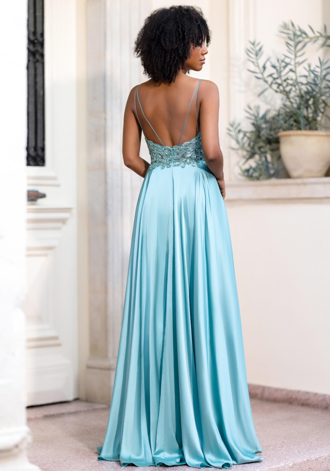 Na parte frontal, destaca-se a racha elegante que acrescenta sensualidade equilibrada e alonga visualmente a silhueta. As alças finas prolongam-se nas costas, formando um desenho delicado e feminino, com fecho invisível na costa para um acabamento discreto e perfeito.