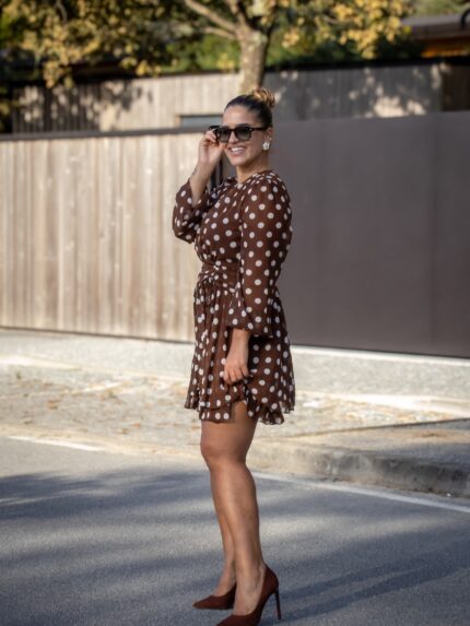 VESTIDO CASTANHO CURTO COM BOLAS BRANCAS PONTO CHIC