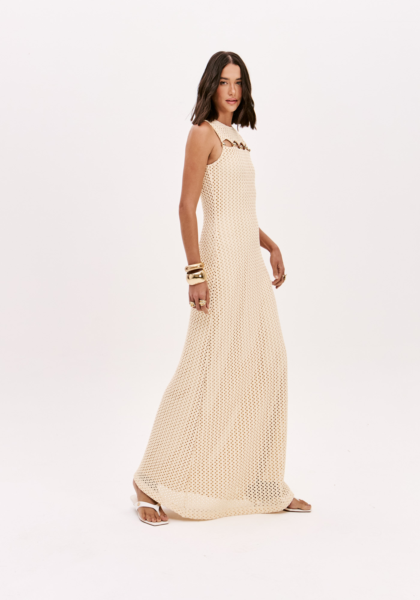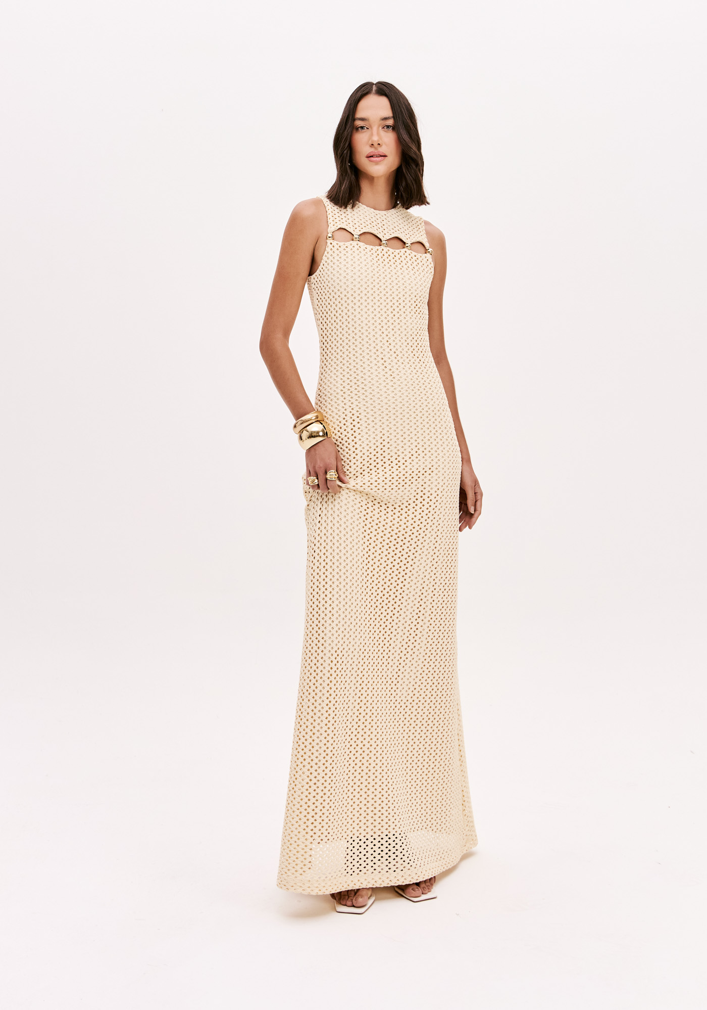 VESTIDO LONGO CREME EM MALHA PERFURADA COM DETALHE DOURADO LANÇA PERFUME
