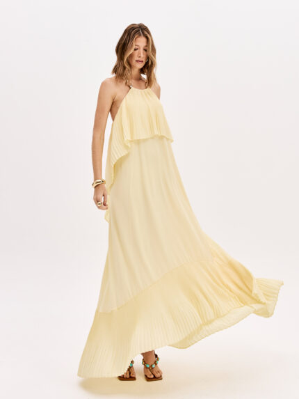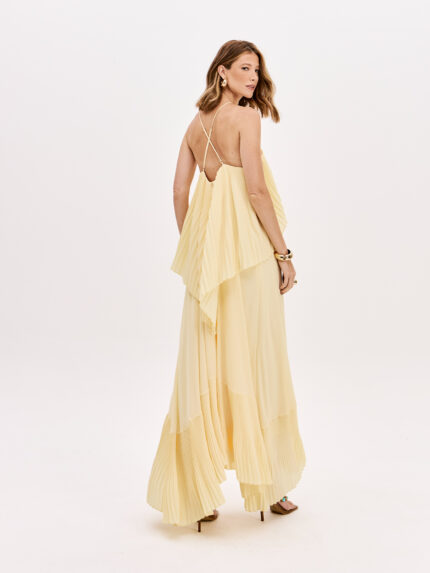 Vestido longo em tom creme suave, confeccionado em malha perfurada com padrão geométrico estruturado, que cria um efeito visual sofisticado e contemporâneo. Uma peça que combina textura, modernidade e elegância numa silhueta marcante.