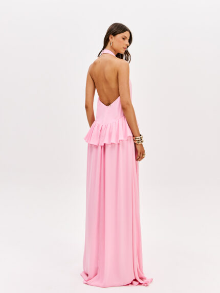 VESTIDO LONGO ROSA COM FOLHO LANÇA PERFUME