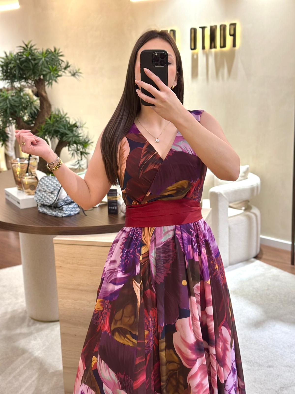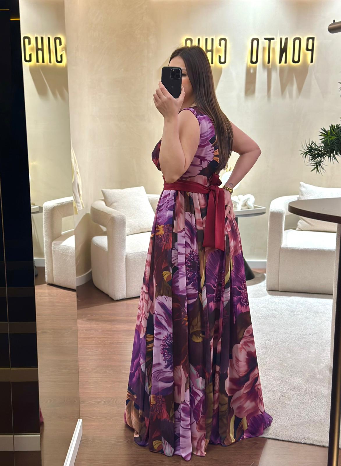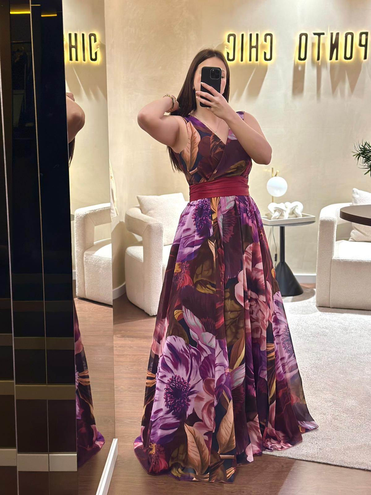 Vestido longo elegante com estampado floral em tons de vinho, roxo e nuances quentes, ideal para cerimónias e eventos especiais onde queres marcar presença com sofisticação.