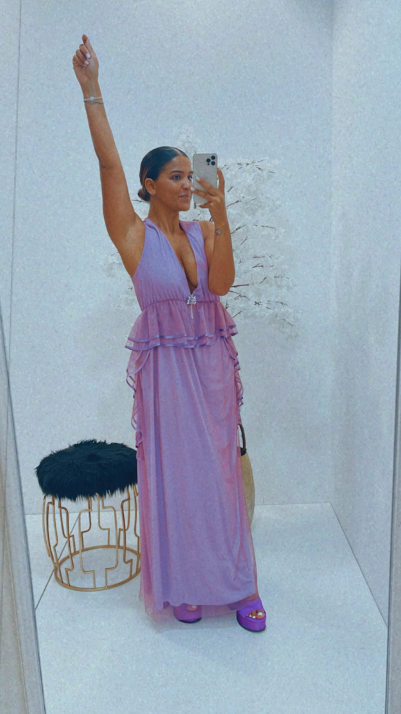 VESTIDO LONGO LILÁS COM FOLHOS E DECOTE PROFUNDO PONTO CHIC