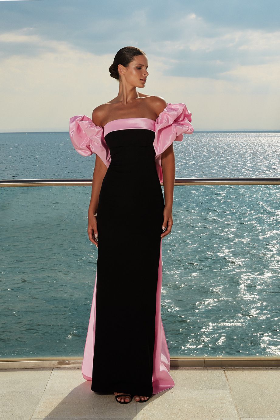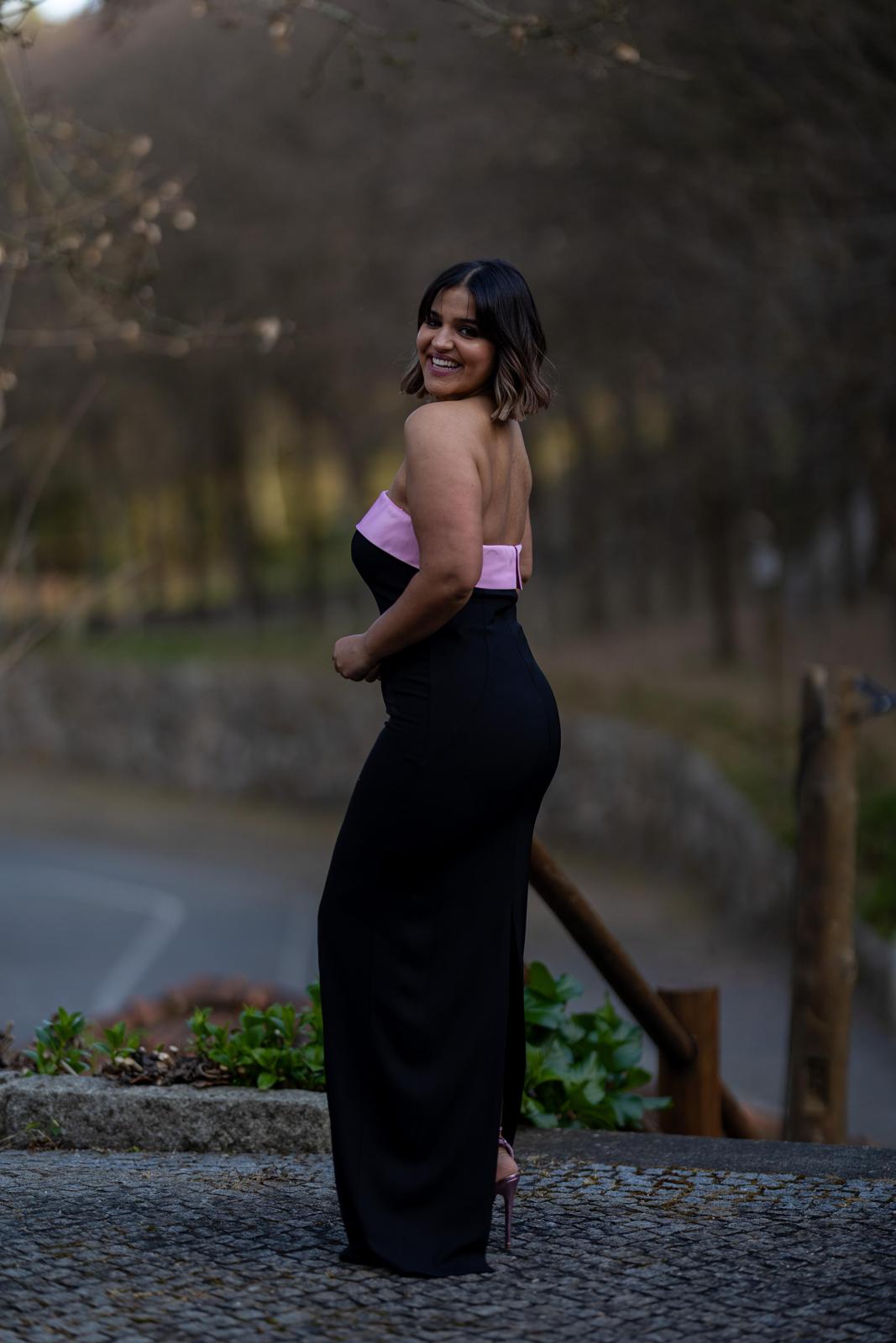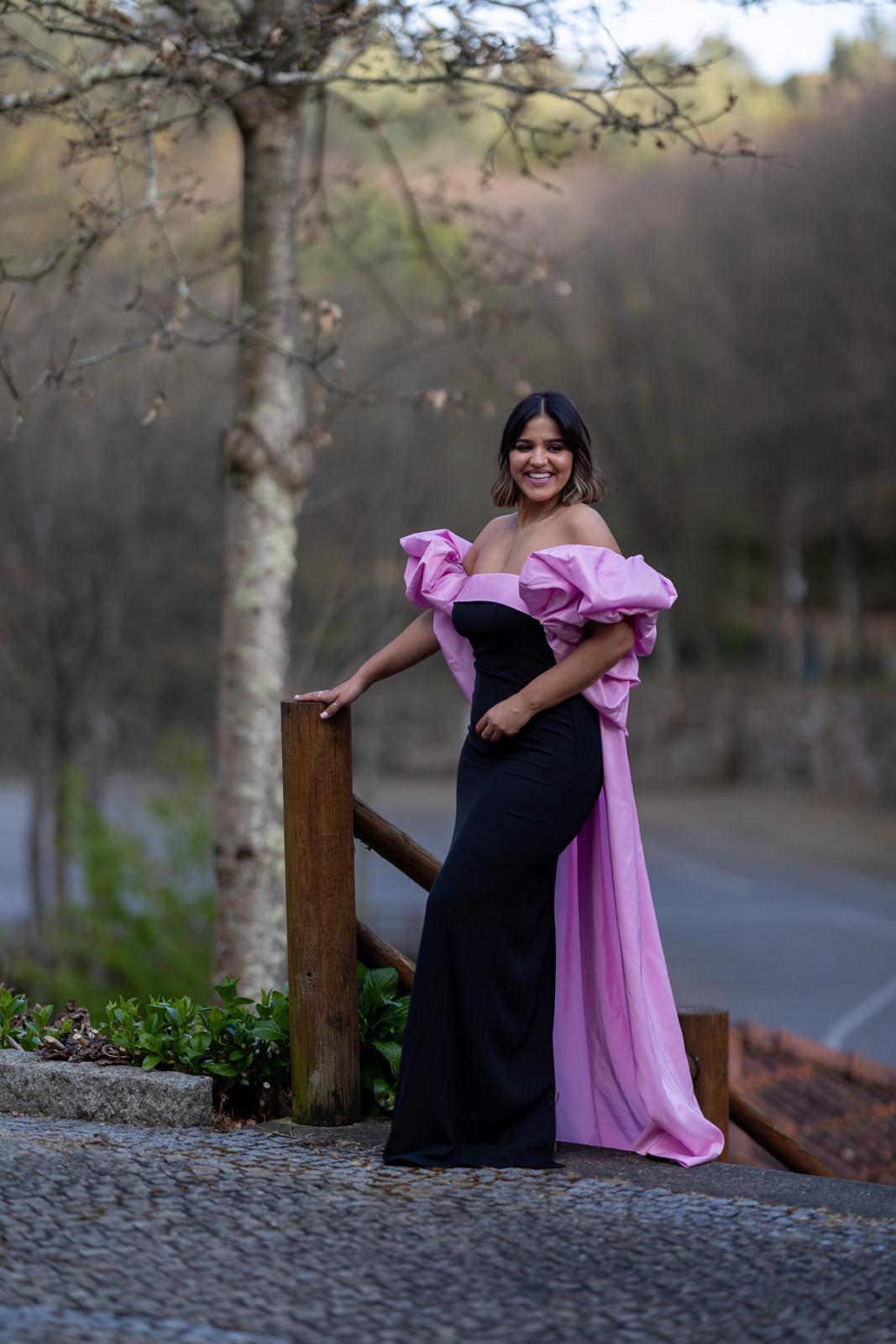 Impactante, feminino e absolutamente inesquecível. Este vestido longo Ponto Chic combina a elegância intemporal do preto com a ousadia de uma capa rosa fluida que transforma completamente o look.
