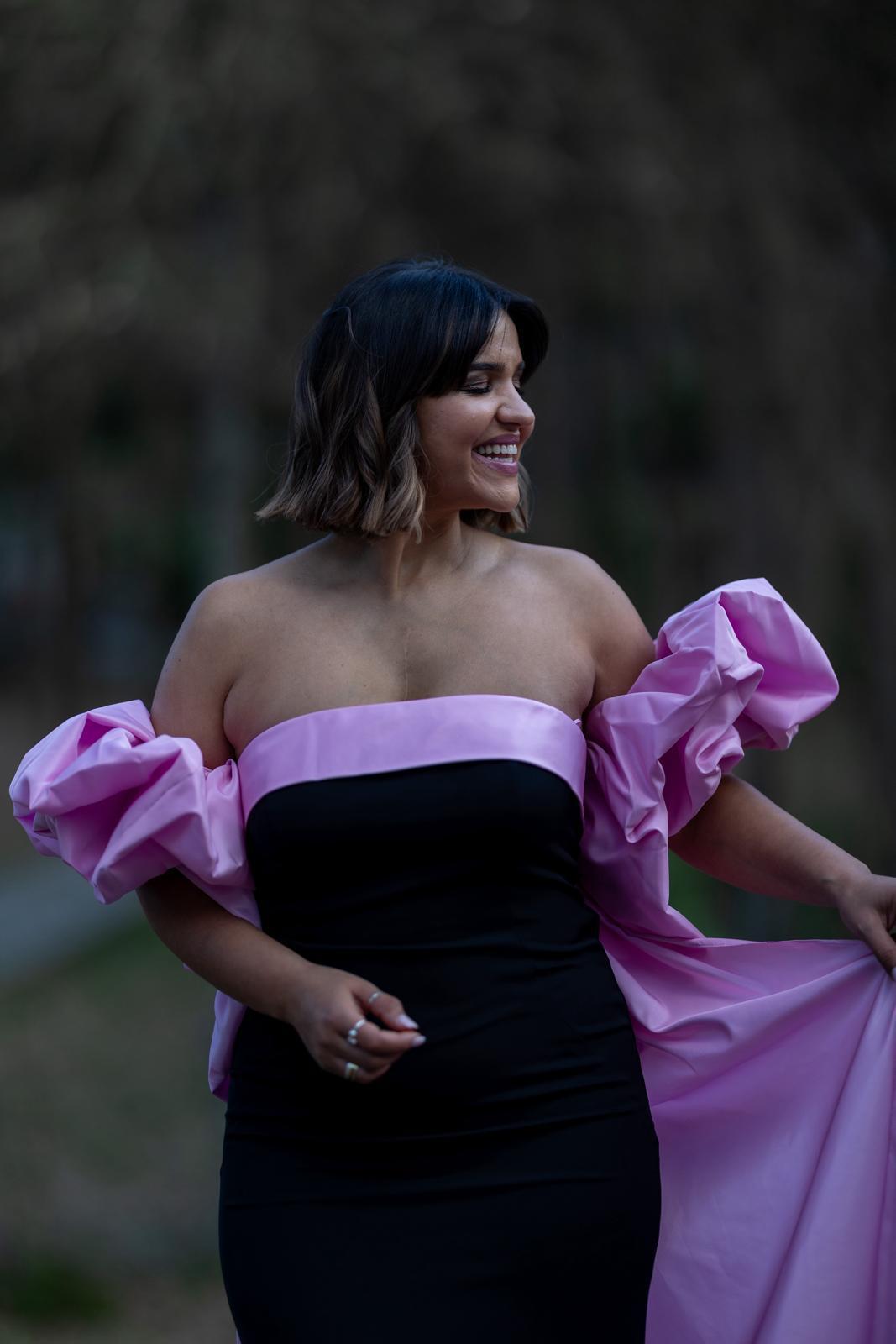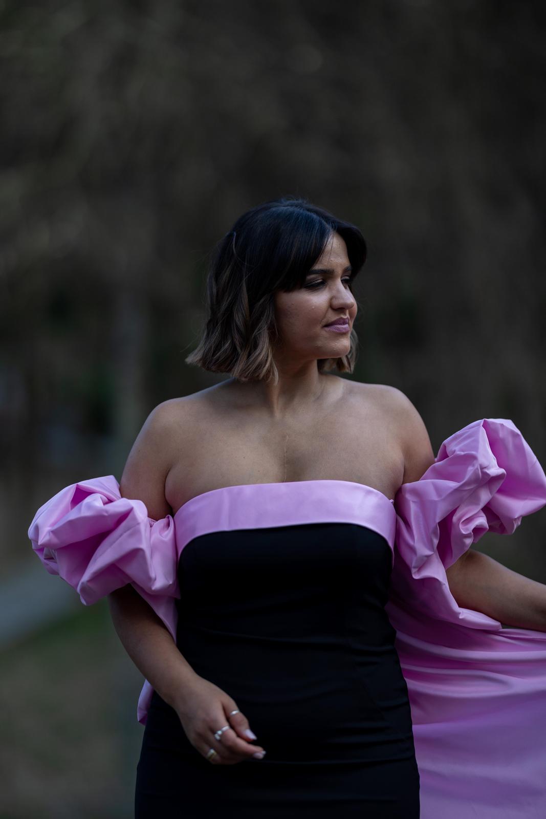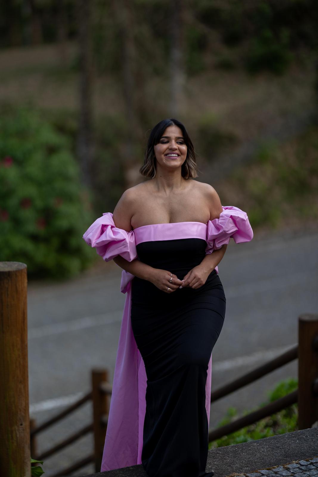 Impactante, feminino e absolutamente inesquecível. Este vestido longo Ponto Chic combina a elegância intemporal do preto com a ousadia de uma capa rosa fluida que transforma completamente o look.