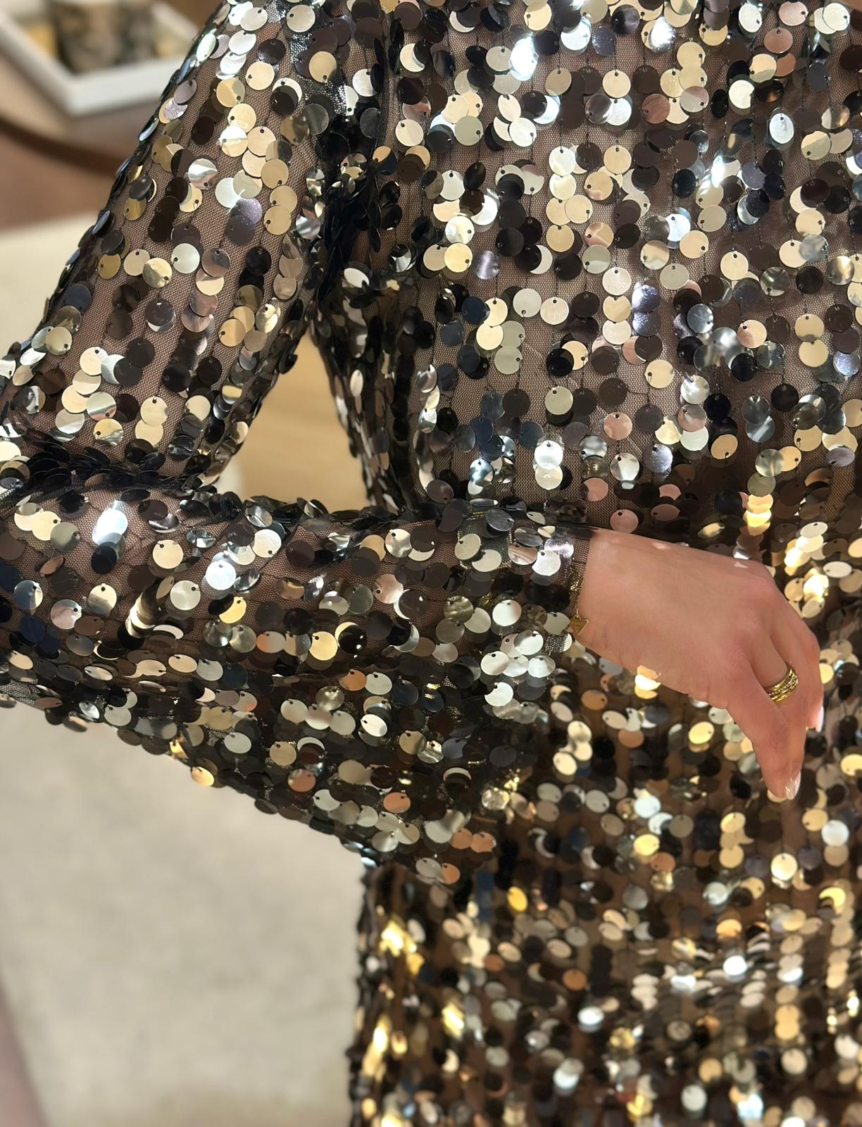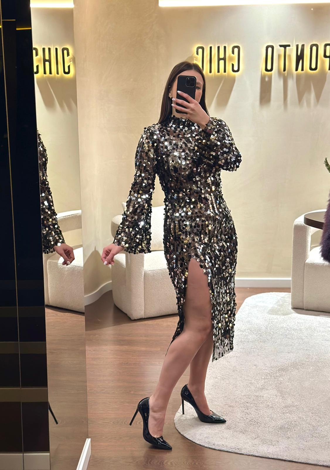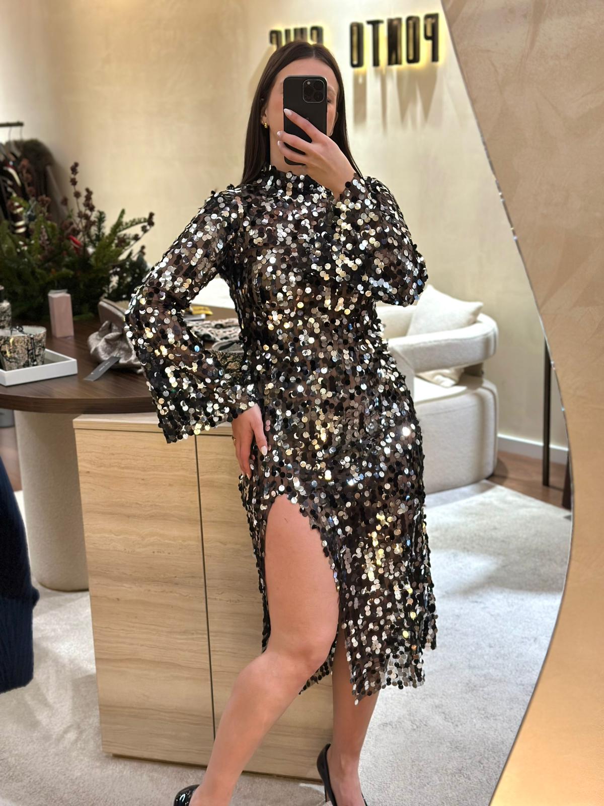 Com corte longo e imponente, este modelo inclui mangas compridas, gola subida e uma silhueta cintada que valoriza a figura com discrição. As lantejoulas oversized conferem-lhe um brilho intenso e moderno, tornando cada movimento numa explosão de luz. Elegante, ousado e marcante, este vestido é uma verdadeira peça de impacto.