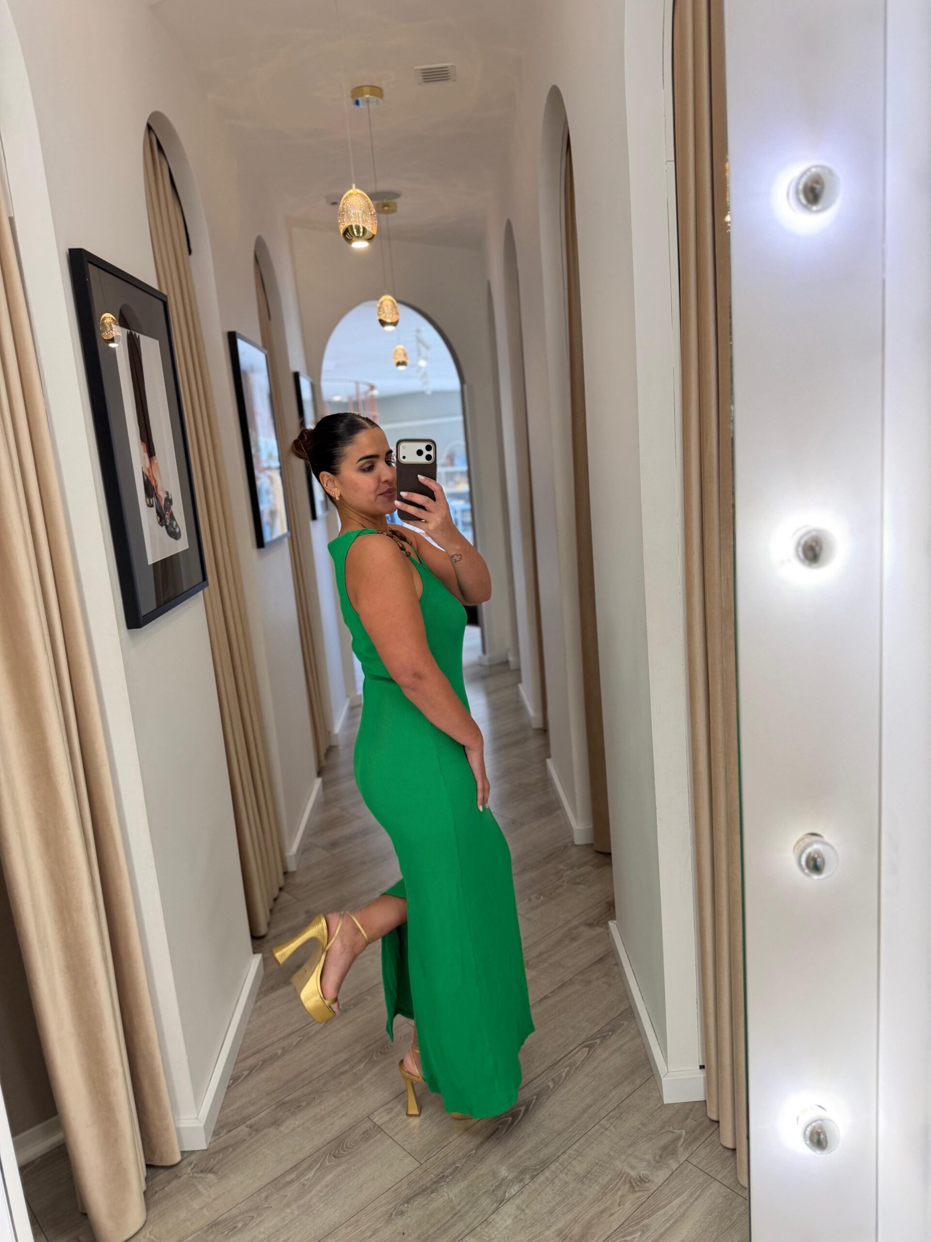 Vestido comprido em malha canelada verde, uma peça que combina conforto e sofisticação com um toque diferenciador. Confeccionado em tecido elástico (94% poliamida, 6% elastano), ajusta-se ao corpo de forma natural, valorizando a silhueta com um caimento fluido e elegante.