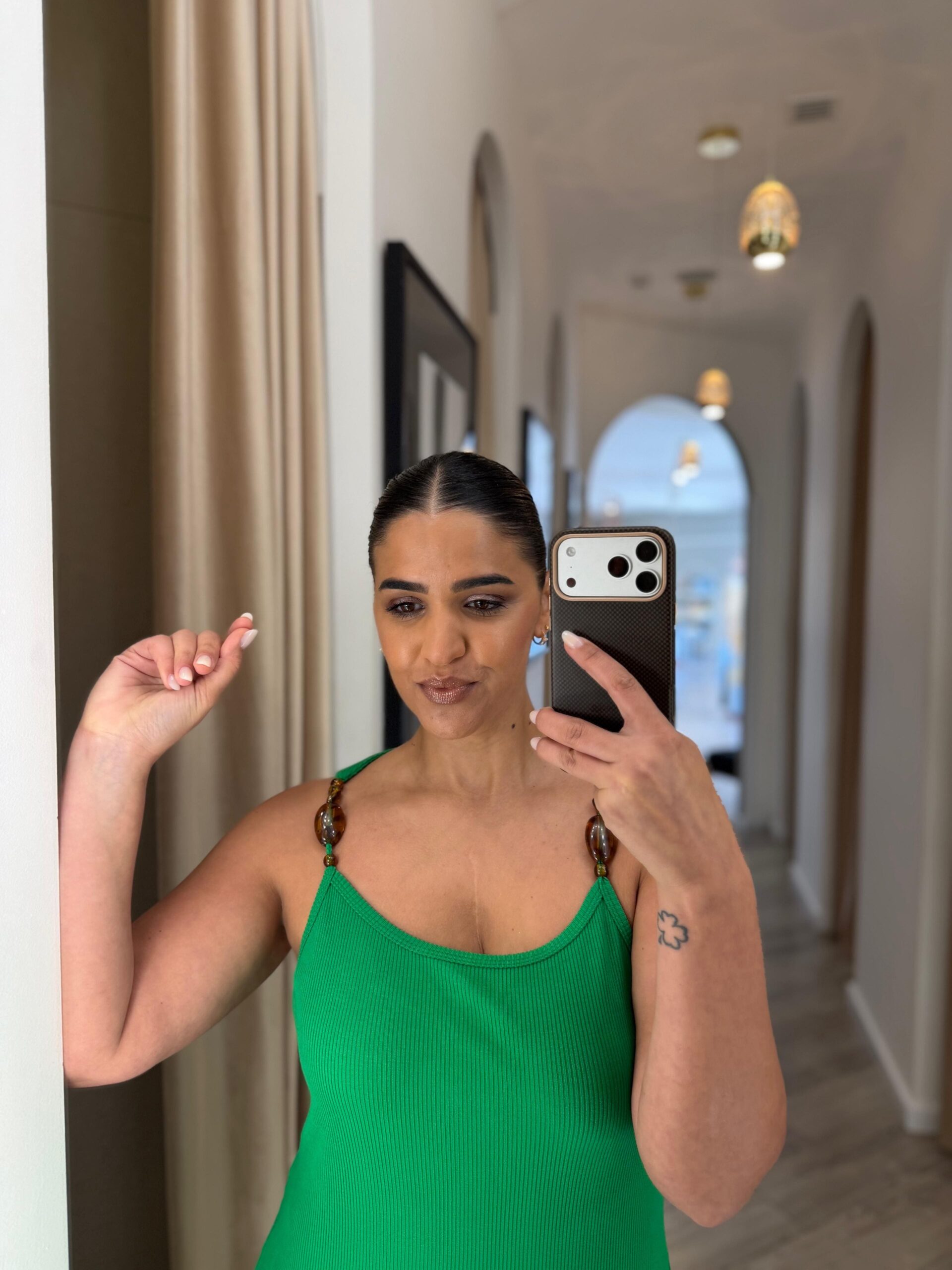 VESTIDO MALHA CANELADA VERDE COM ALÇAS DETALHE CONTAS LANÇA PERFUME
