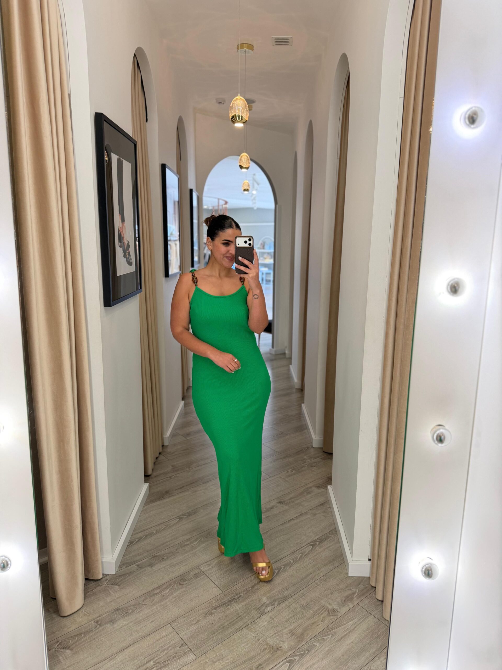 VESTIDO MIDI VERDE COM ALÇAS DE MISSANGAS LANÇA PERFUME