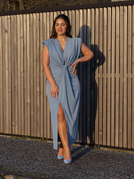 Vestido com decote em V na frente, pormenor de pregas na zona do decote. Manga curta. Fecho inviisvel na lateral esquerda. Composição: 100% Poliéster