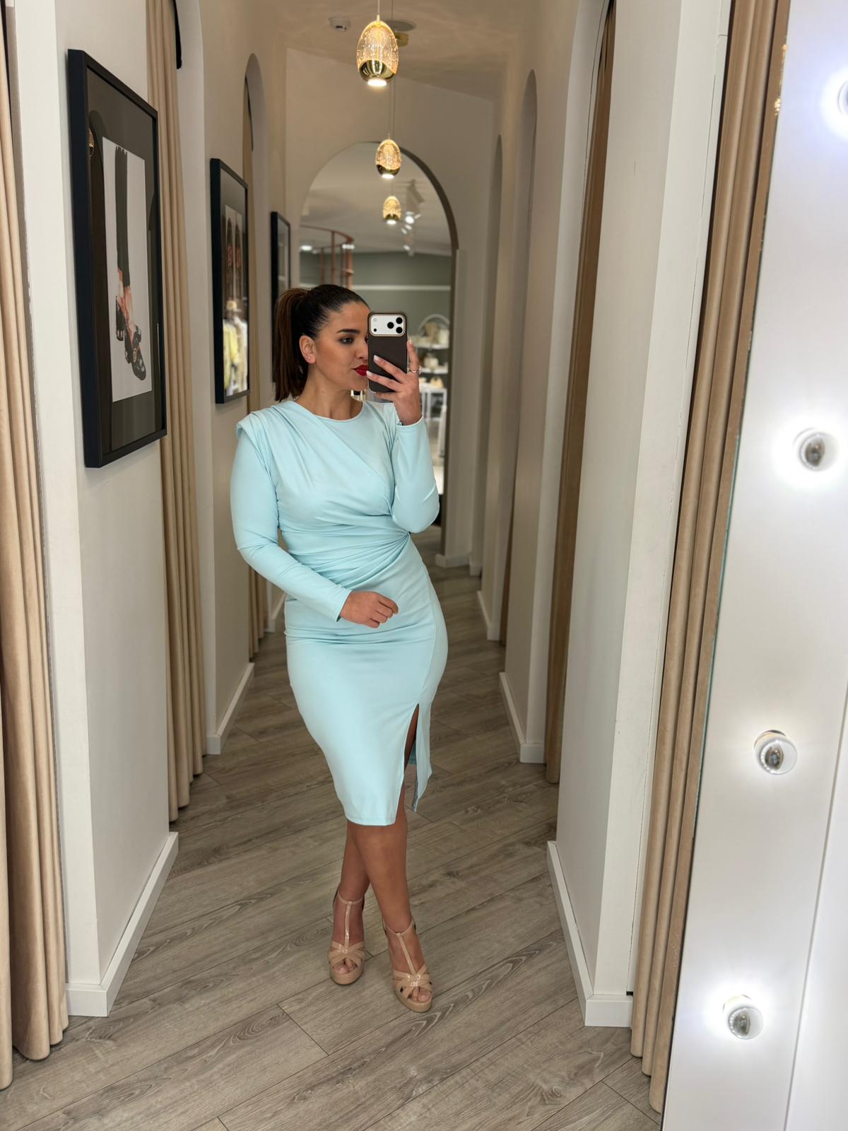VESTIDO MIDI AZUL BEBE DRAPEADO COM MANGA COMPRIDA PONTO CHIC
