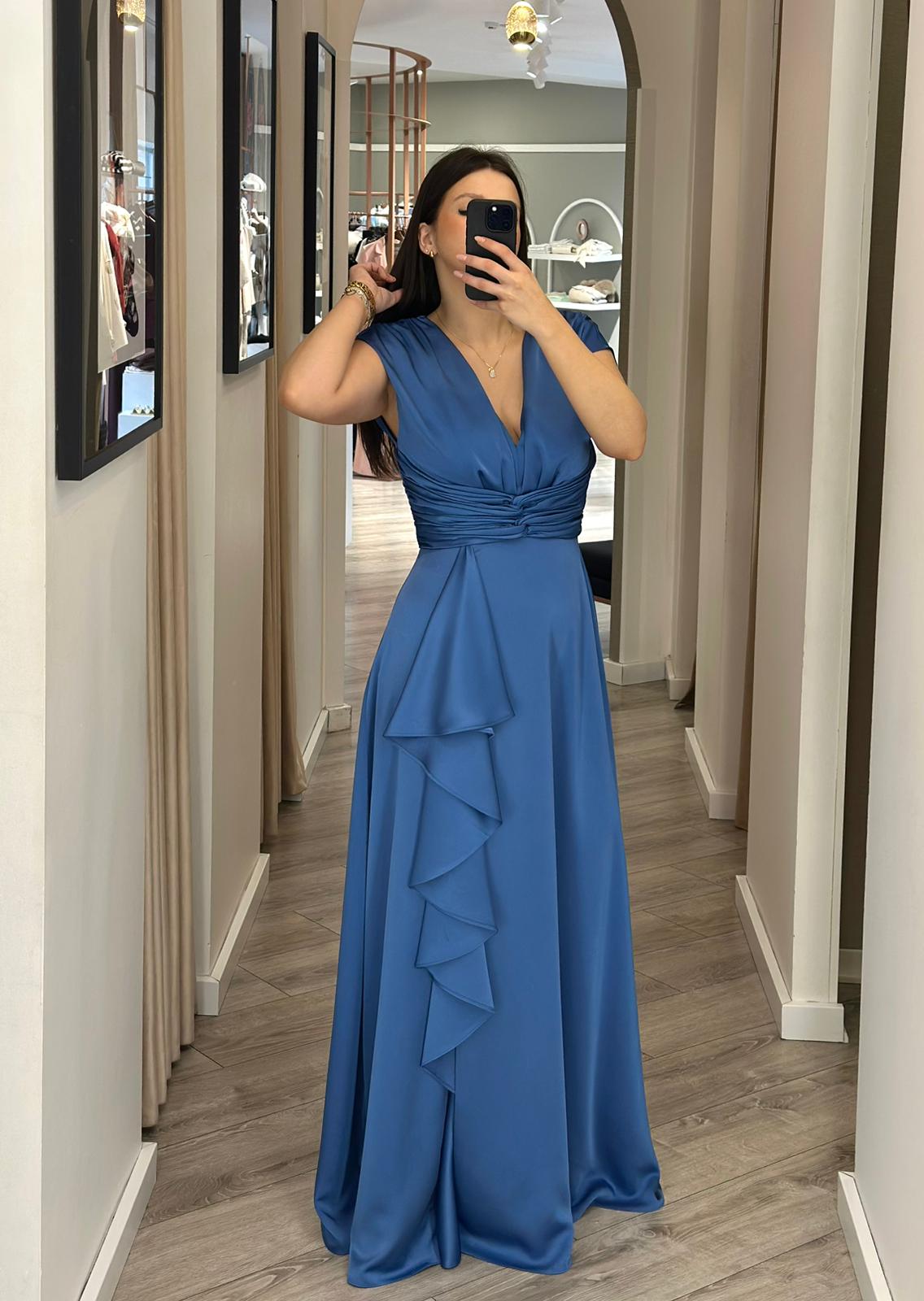 VESTIDO MIDI AZUL COM DECOTE E