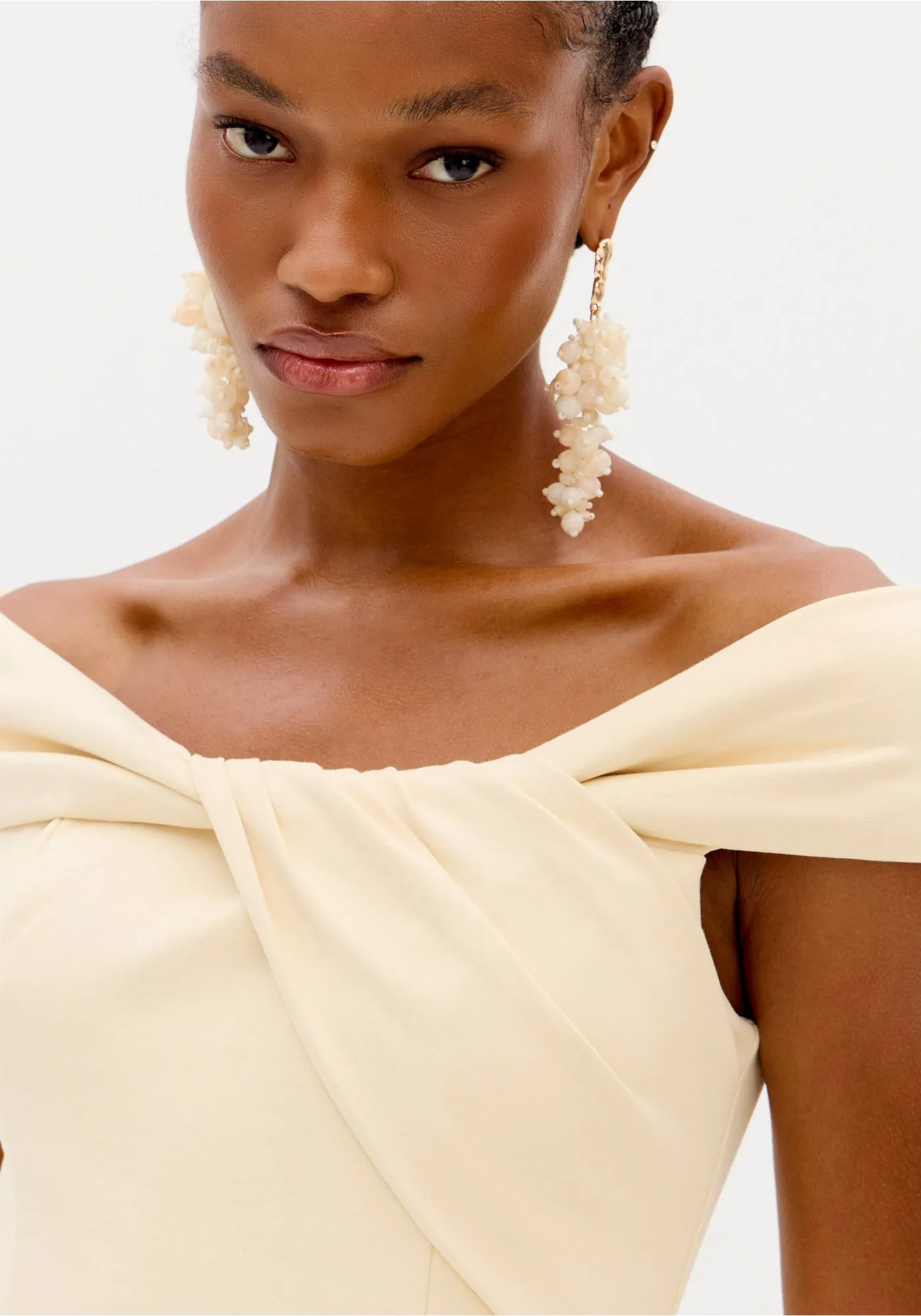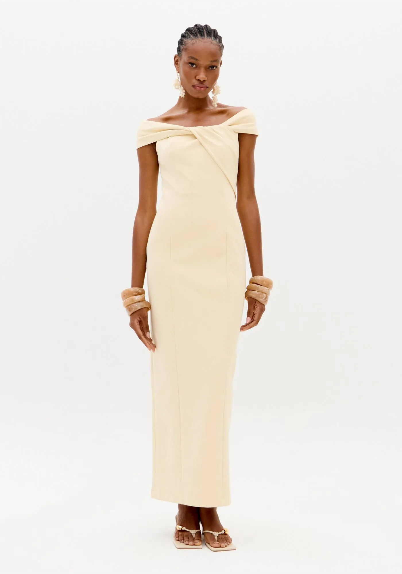 VESTIDO MIDI BEGE OMBRO A OMBRO LANÇA PERFUME