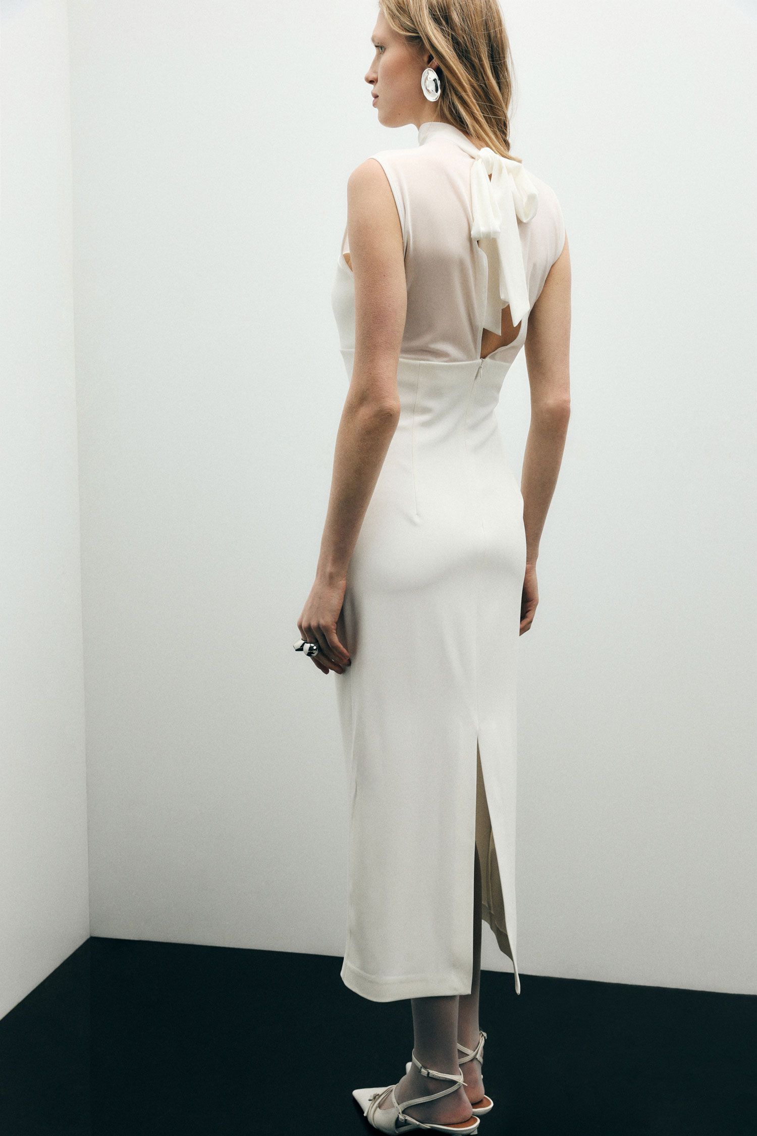 A saia de comprimento midi apresenta um corte limpo e elegante, ideal para criar looks refinados e equilibrados. Nas costas, o vestido surpreende com uma abertura em decote profundo finalizada com um delicado laço, detalhe que acrescenta romantismo e torna a peça ainda mais especial.