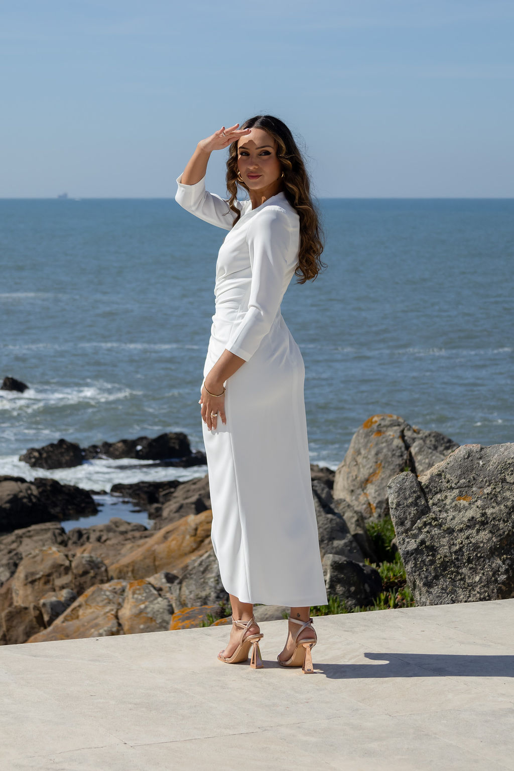 As mangas três quartos conferem equilíbrio e sofisticação à peça, mantendo uma linha clean e intemporal, ideal para diferentes tipos de cerimónia.