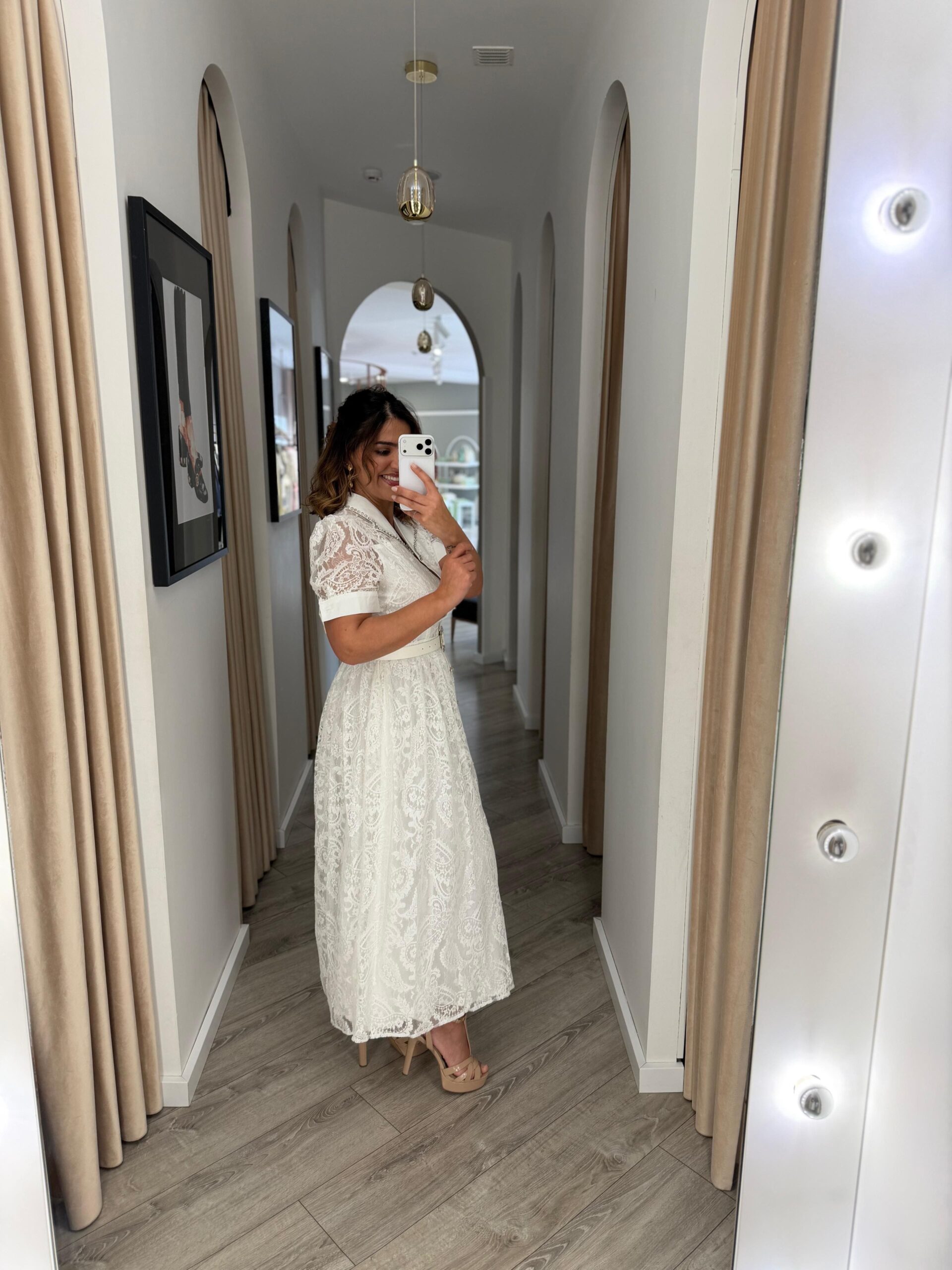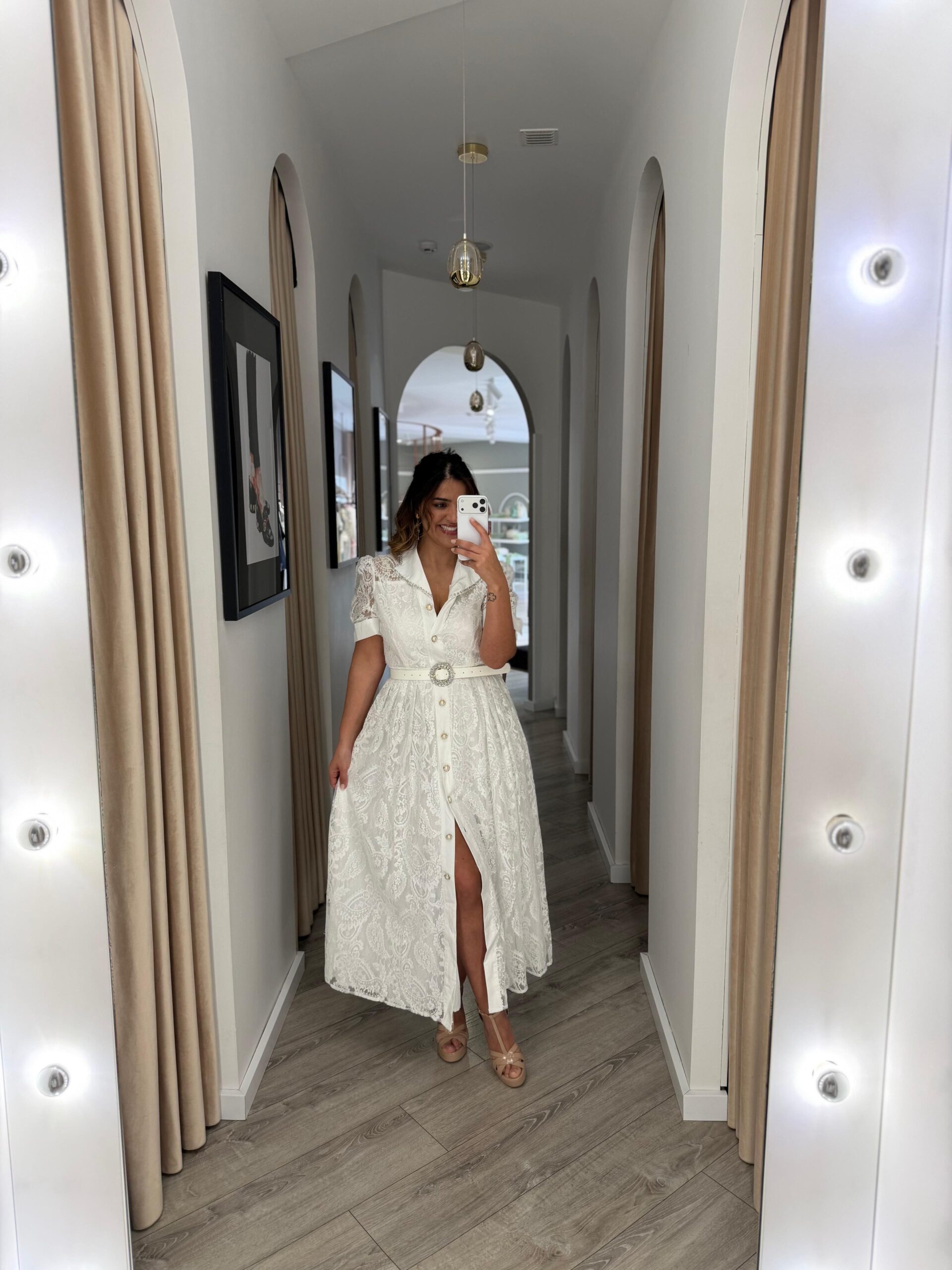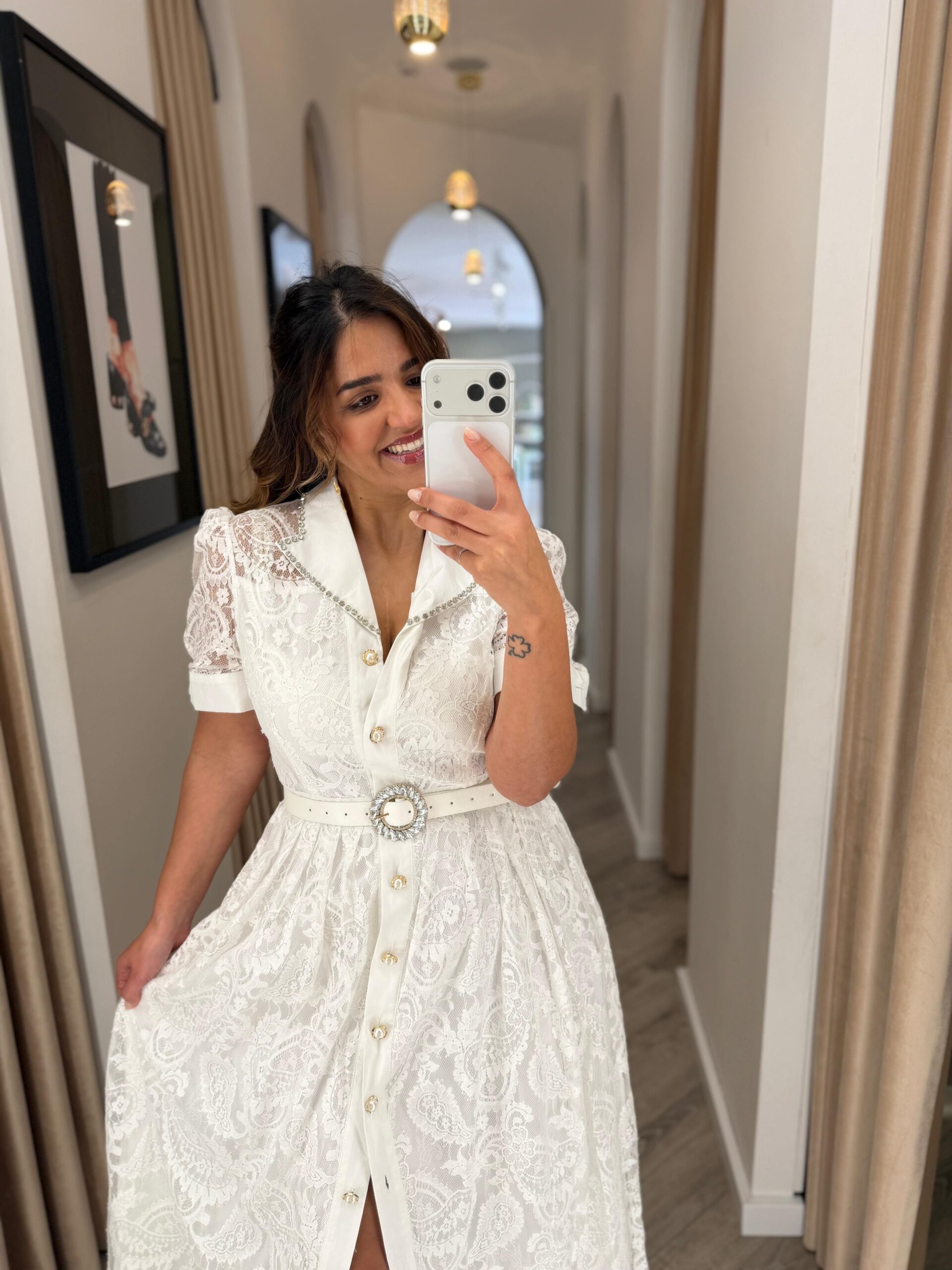 VESTIDO MIDI BRANCO EM RENDA COM CINTO E DETALHES EM BRILHO PONTO CHIC