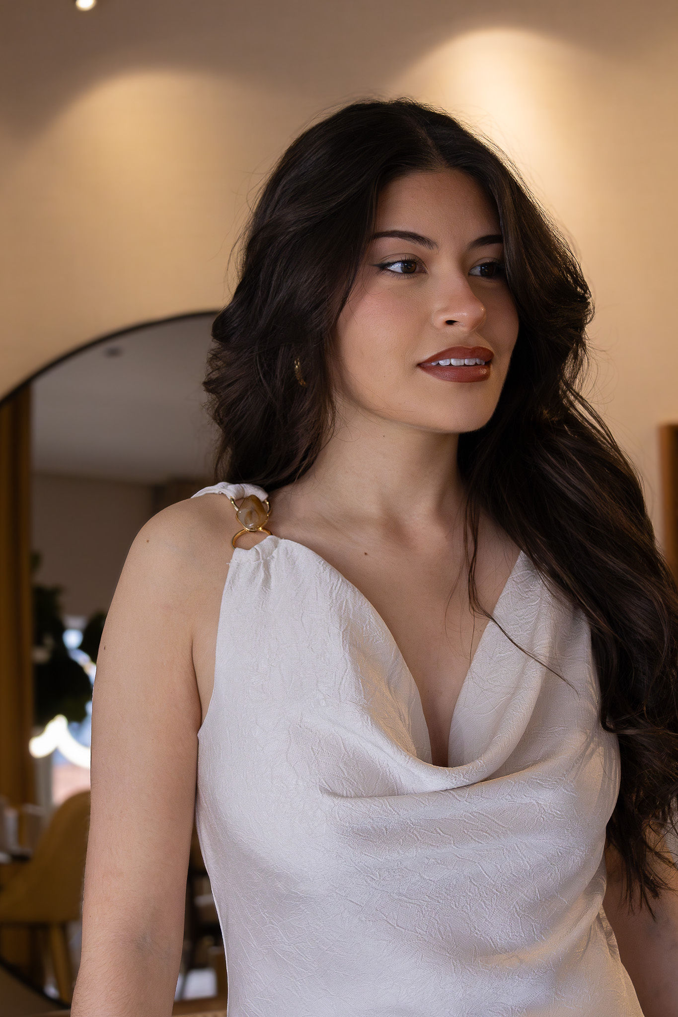 Destaca-se pelo decote drapeado, que cria um efeito elegante e sensual na zona do busto, e pelas alças finas ajustáveis, proporcionando conforto e adaptação perfeita ao corpo. O detalhe da argola dourada decorativa na zona da alça acrescenta um toque premium e sofisticado, elevando o design da peça.