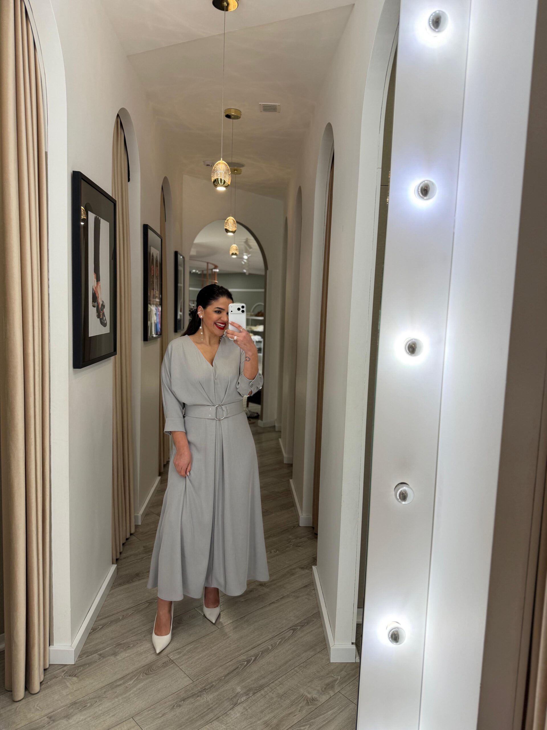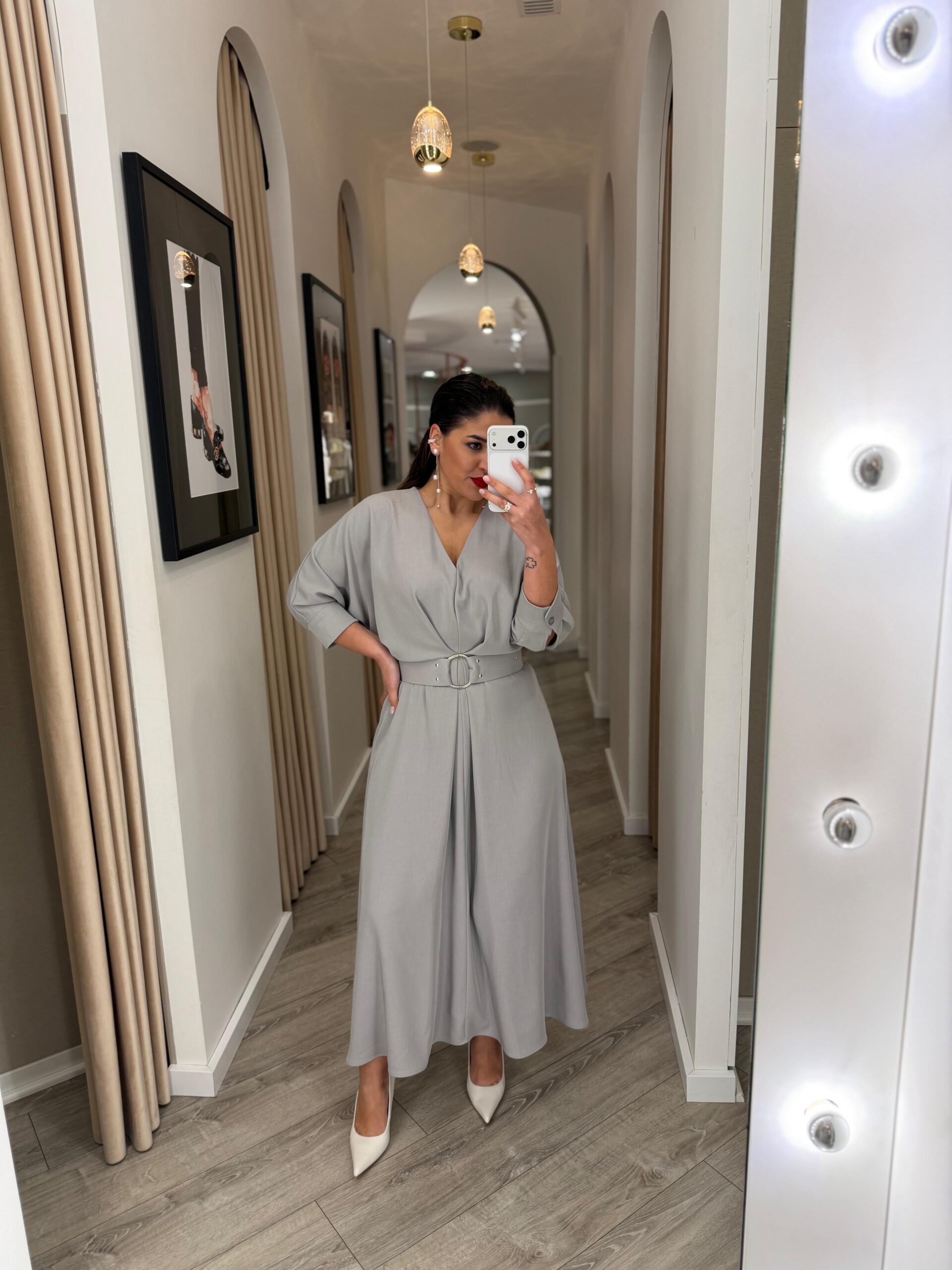 VESTIDO MIDI CINZA COM CINTO E