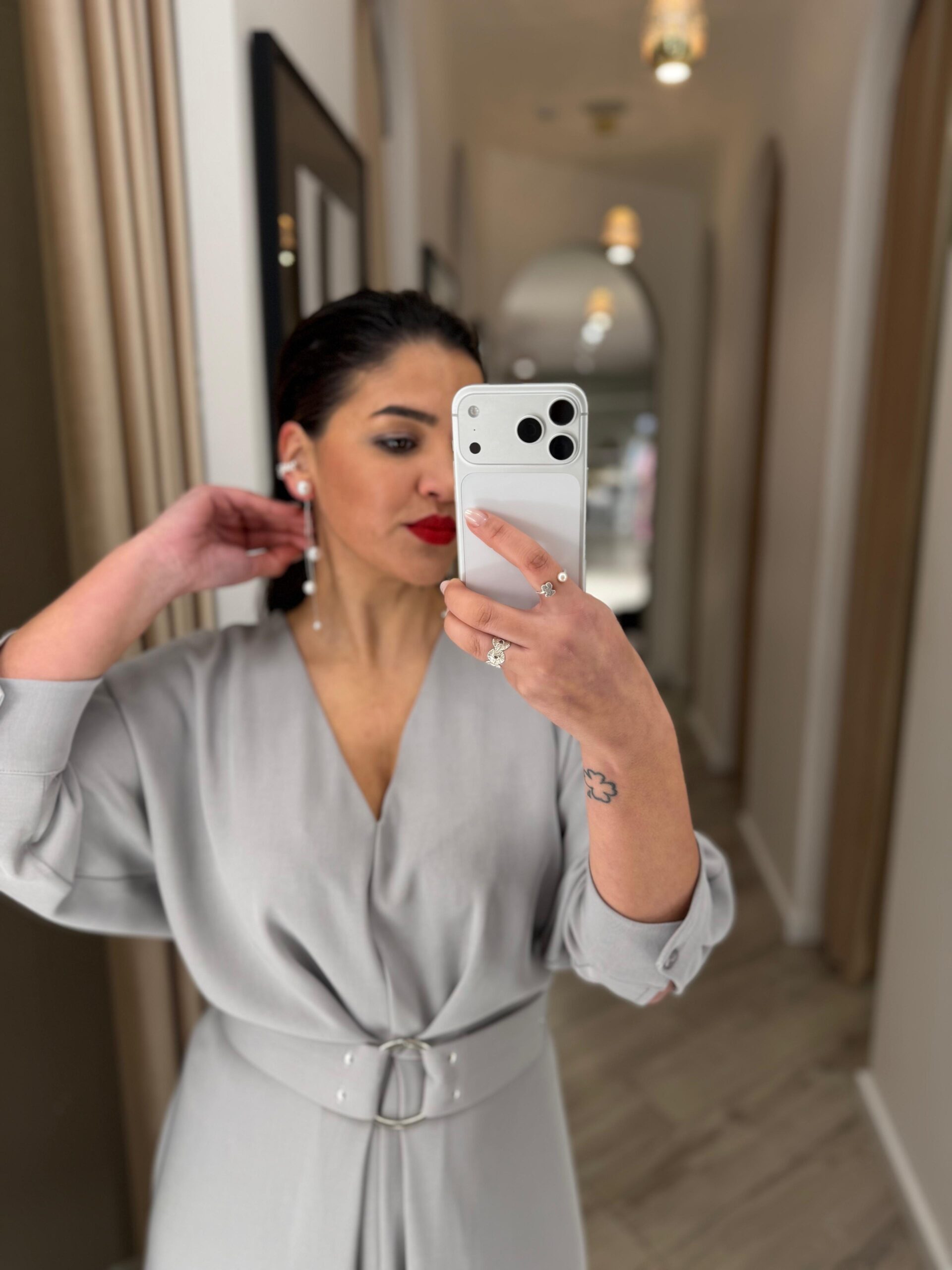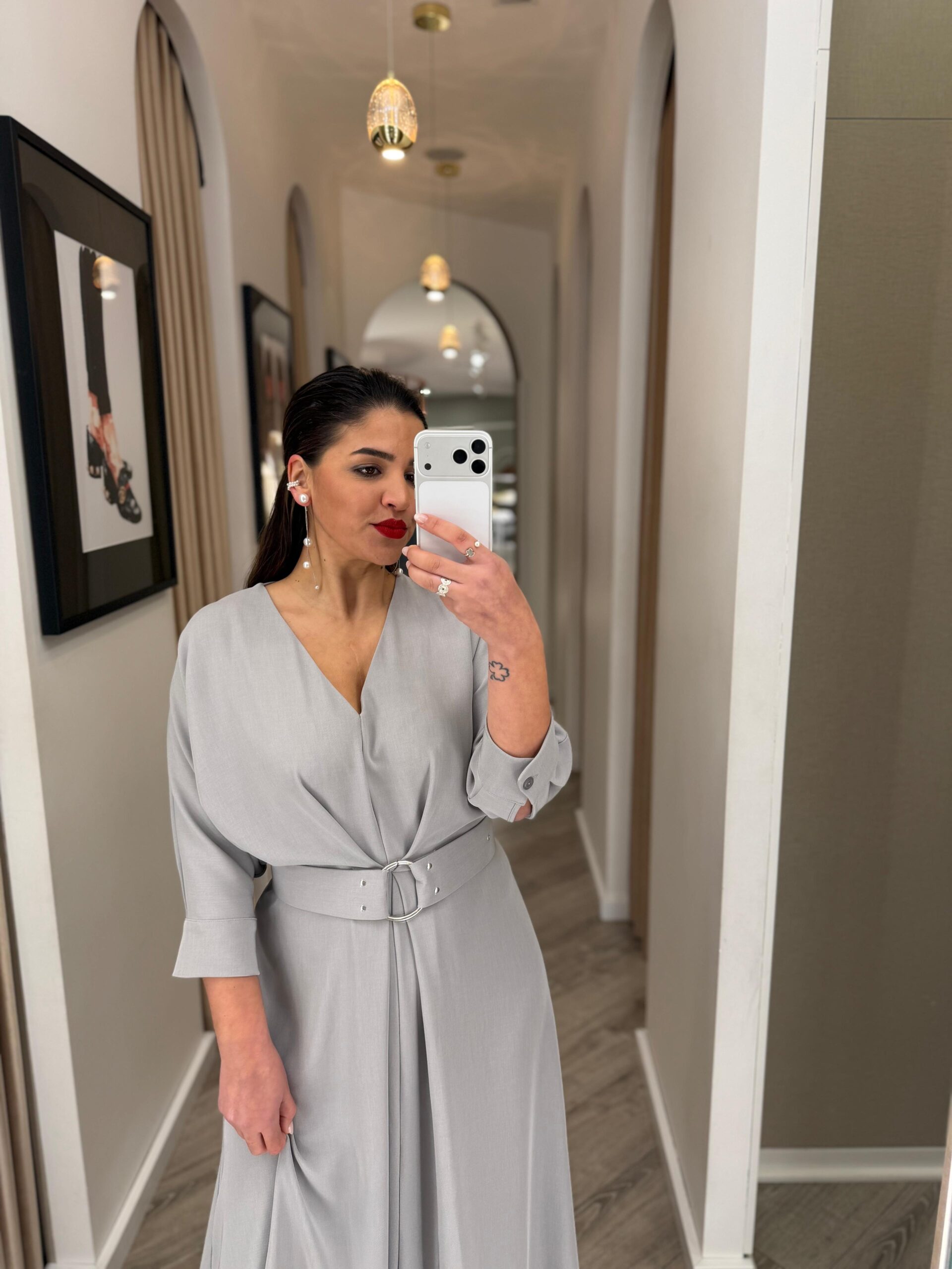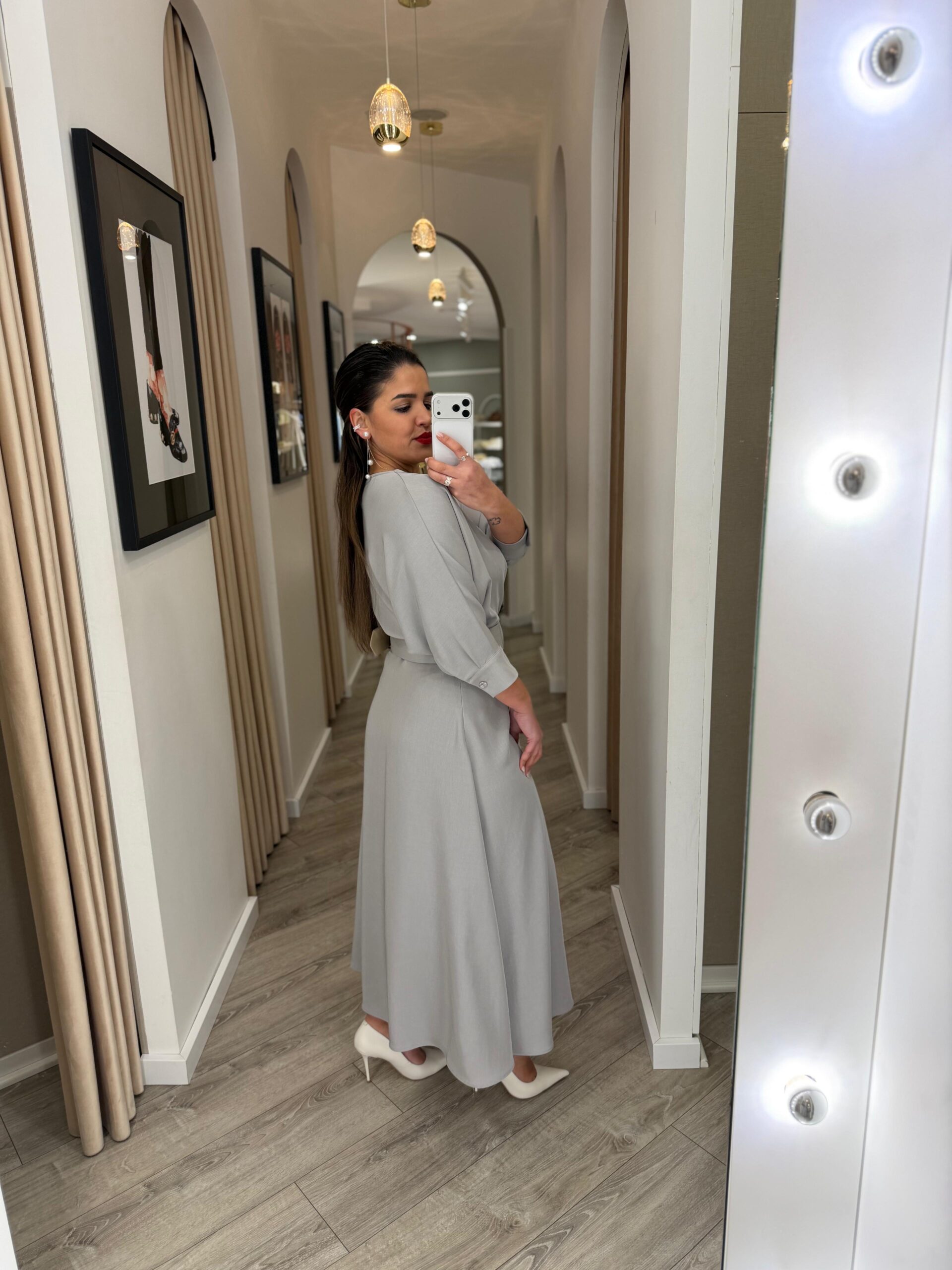 Vestido midi em tom cinza elegante, uma cor intemporal e sofisticada que transmite classe e versatilidade. O decote em bico profundo alonga a silhueta e valoriza o colo de forma subtil, criando um equilíbrio perfeito entre feminilidade e modernidade.