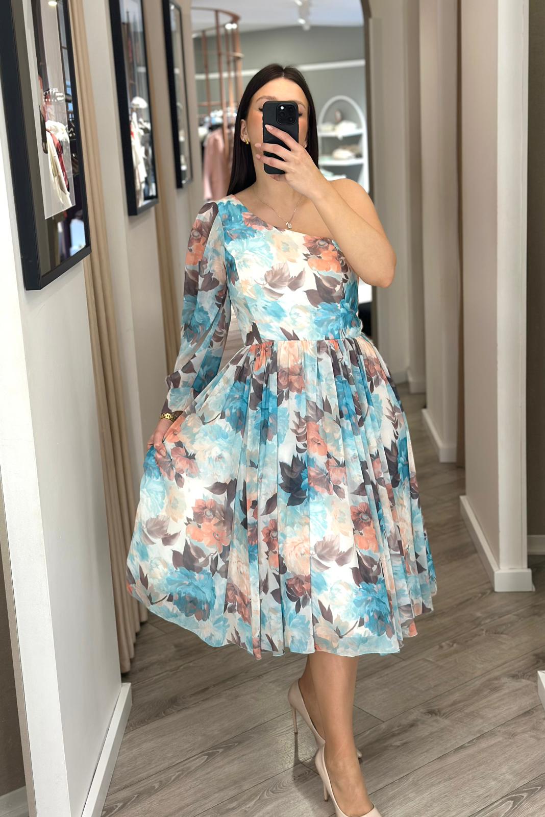 VESTIDO MIDI ESTAMPADO ASSIMÉTRICO COM MANGA UNILATERAL PONTO CHIC