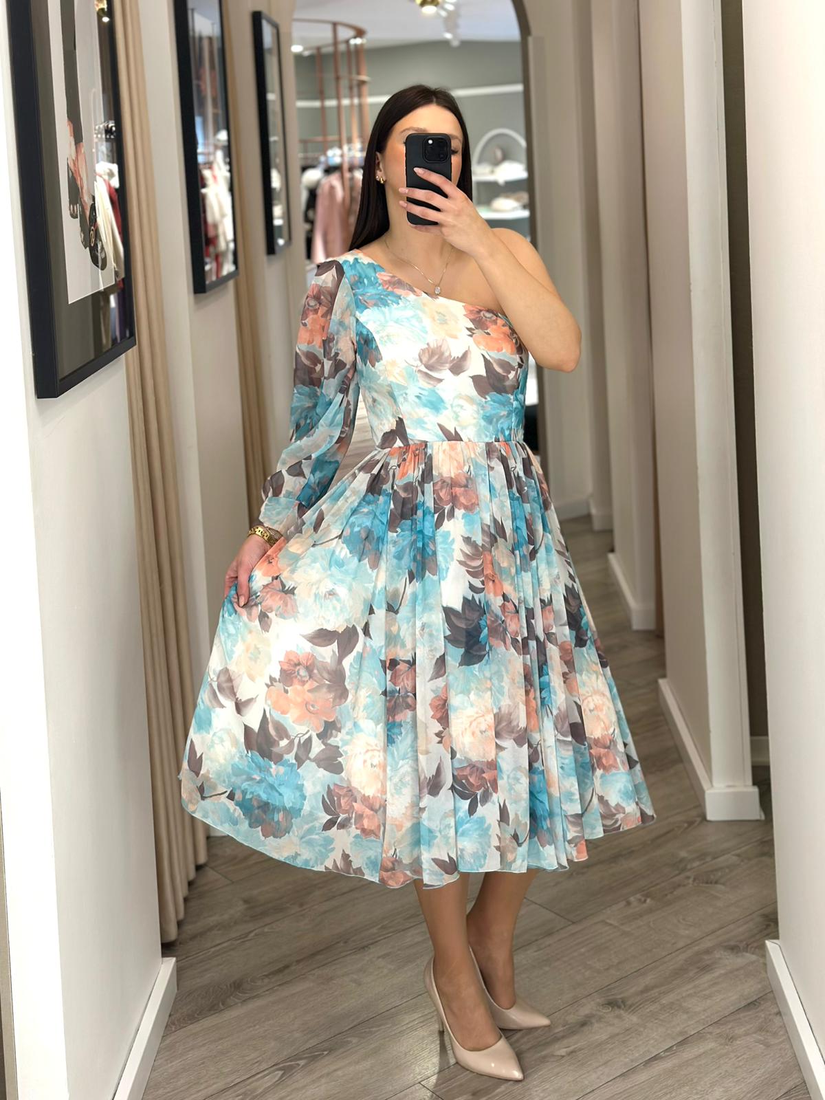 O modelo distingue-se pelo design assimétrico, com manga unilateral fluida, que cria um efeito sofisticado e contemporâneo. O decote delicado, aliado ao corte abaixo do peito, valoriza a silhueta de forma natural, enquanto a saia midi com movimento acrescenta leveza e elegância ao conjunto.