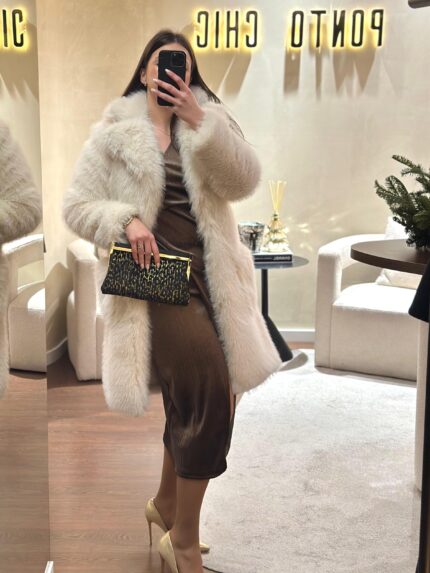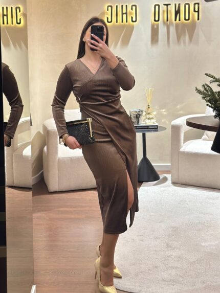 VESTIDO COM DECOTE EM V E ARGOLA DECORATIVA CASTANHO PONTO CHIC