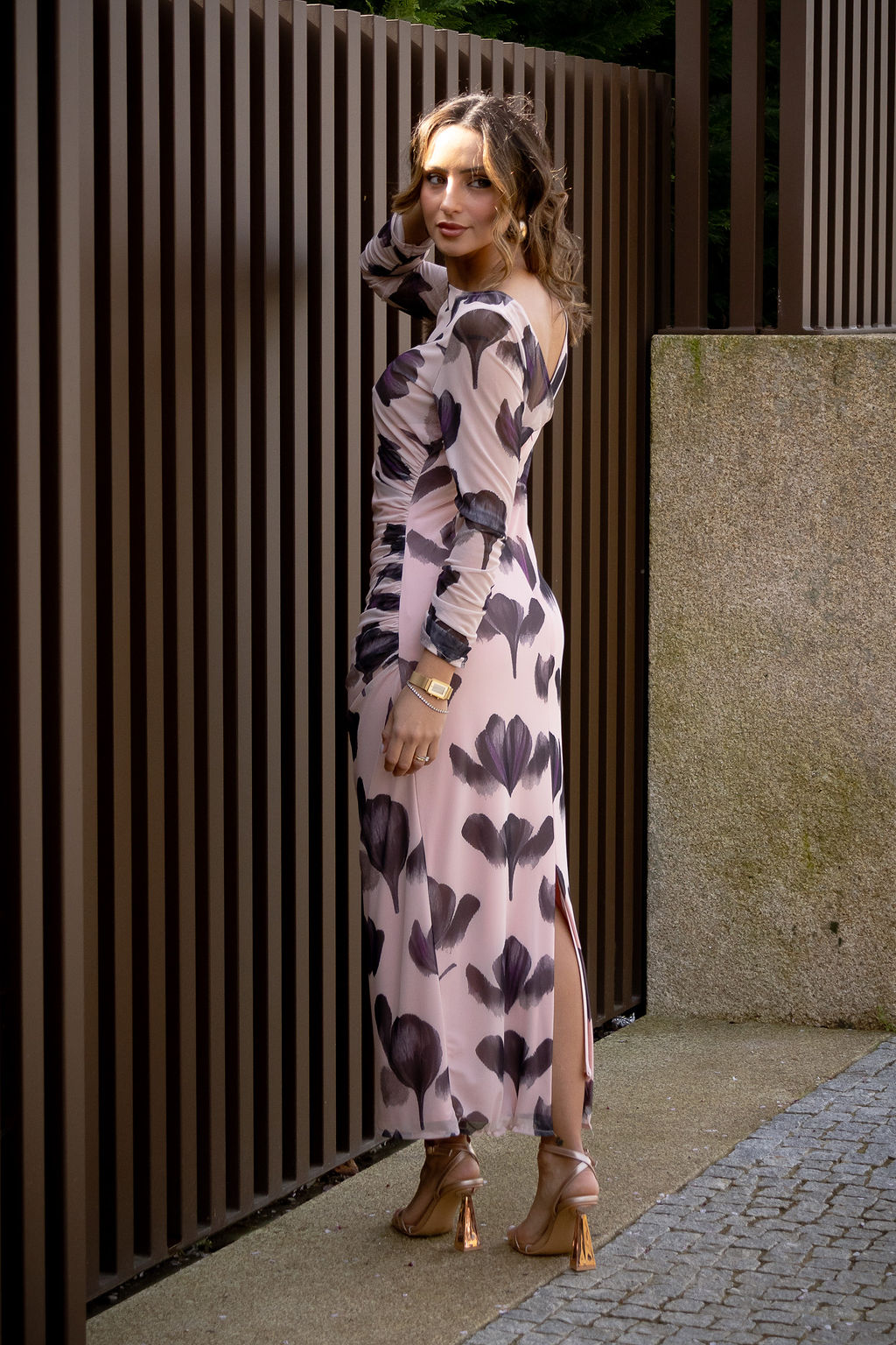 Vestido midi elegante e envolvente, em tom rosa nude com estampado floral artístico em contrastes suaves, pensado para ocasiões especiais onde o conforto e a sofisticação caminham lado a lado.