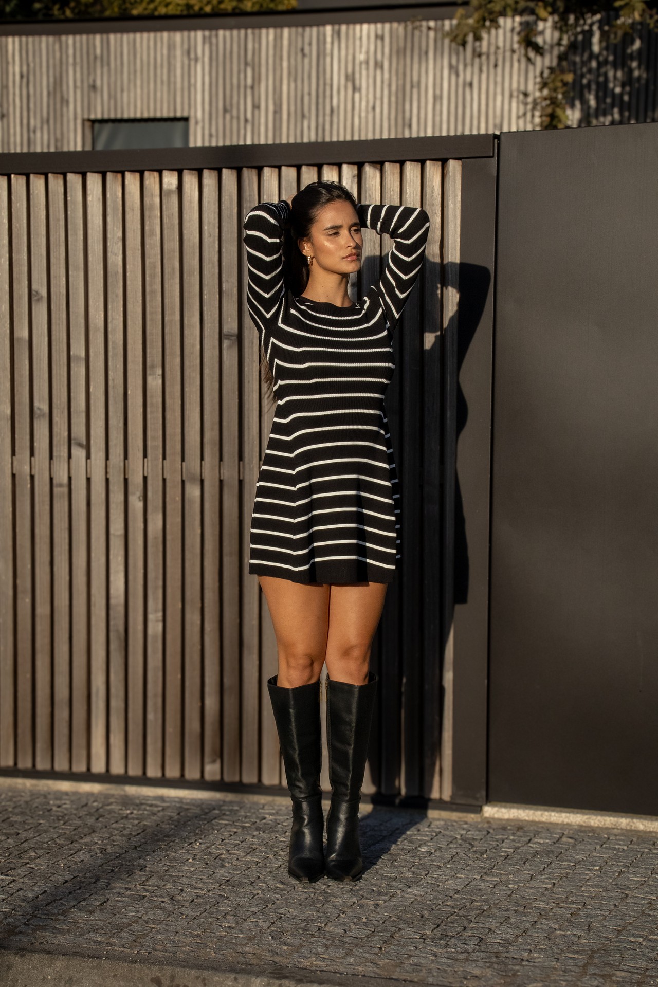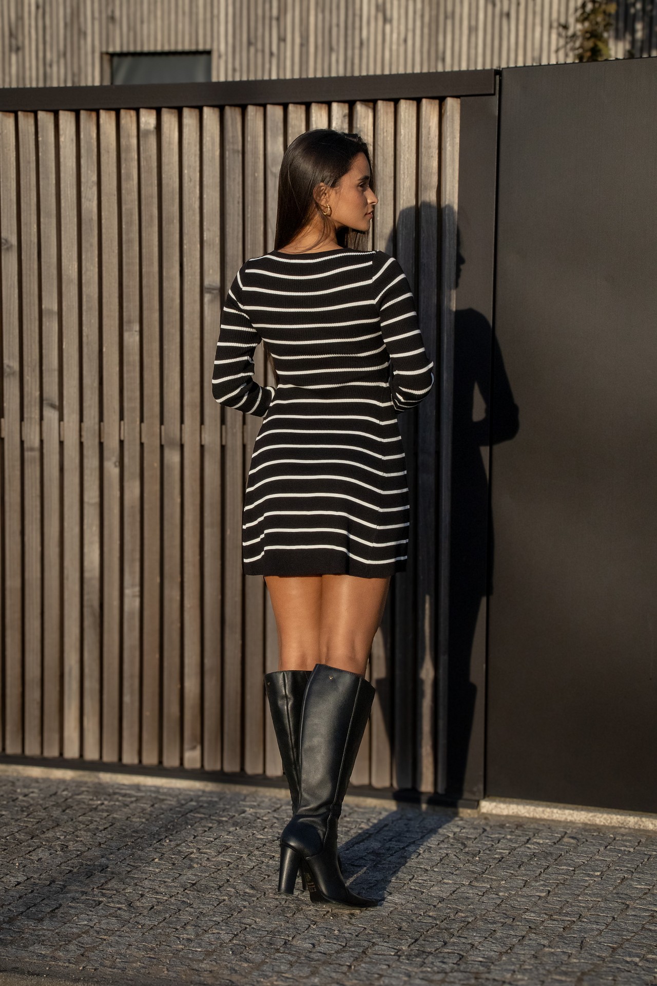 O design destaca-se pelo padrão de riscas brancas horizontais, que acrescentam contraste e intemporalidade, enquanto o corte reto com mangas compridas valoriza a silhueta de forma elegante e versátil.