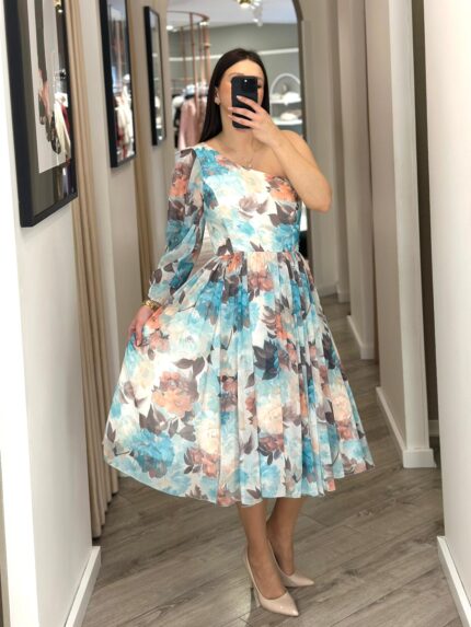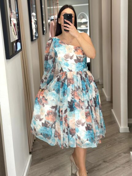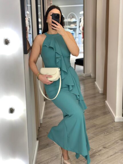 As alças finas e o decote reto ganham destaque com a aplicação de penas na zona do busto, criando um efeito glamoroso e cheio de personalidade. Uma escolha elegante para ocasiões especiais onde queres brilhar sem perder a modernidade.