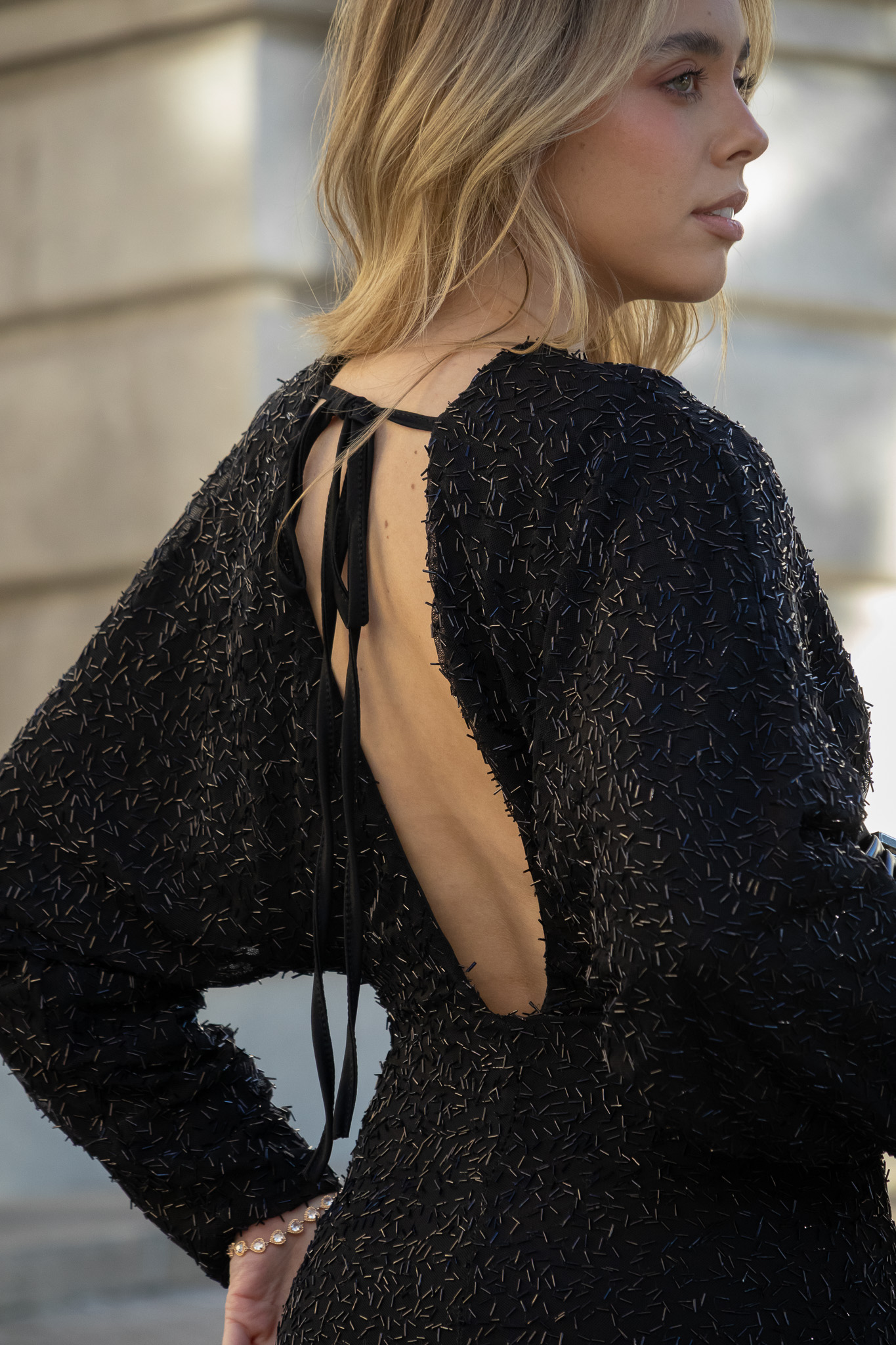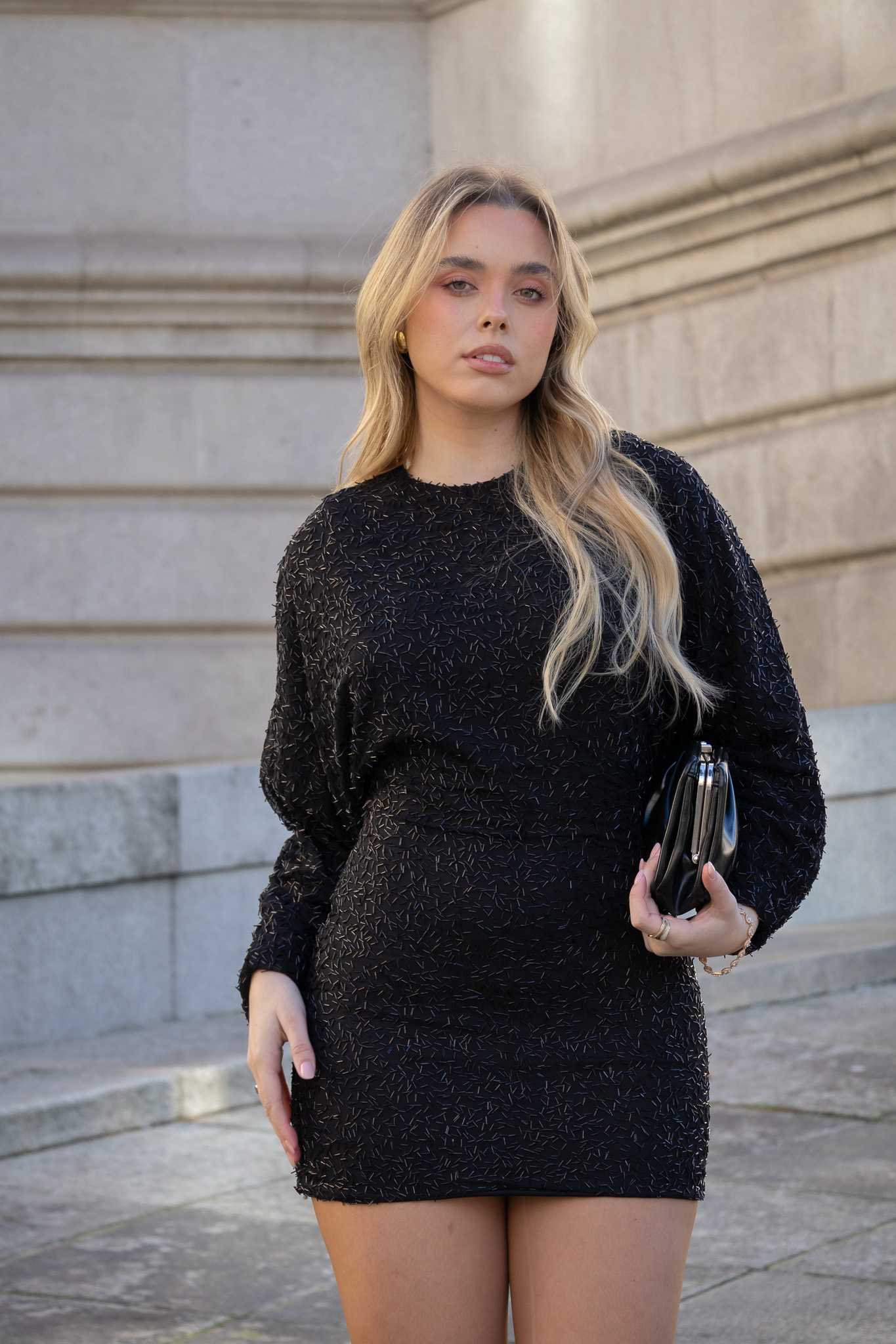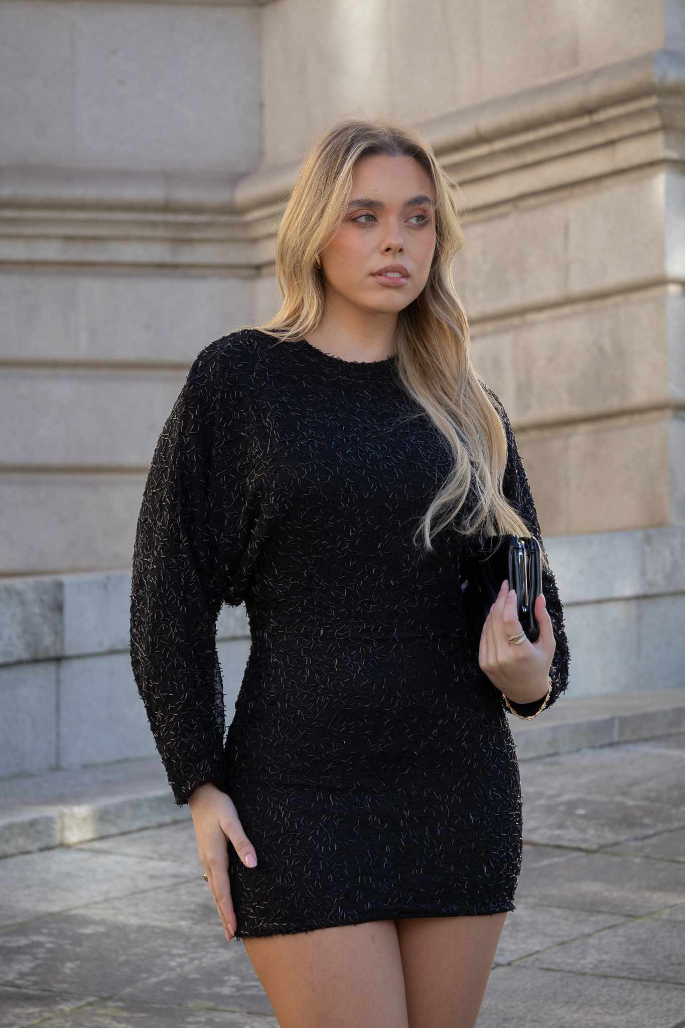 Um vestido que redefine glamour e presença. Totalmente bordado com aplicações brilhantes, este modelo preto cria um efeito luminoso sofisticado que se destaca em qualquer ambiente — ideal para eventos onde queres realmente marcar diferença.