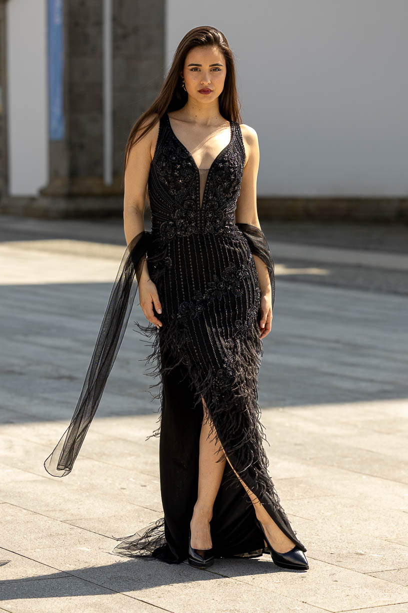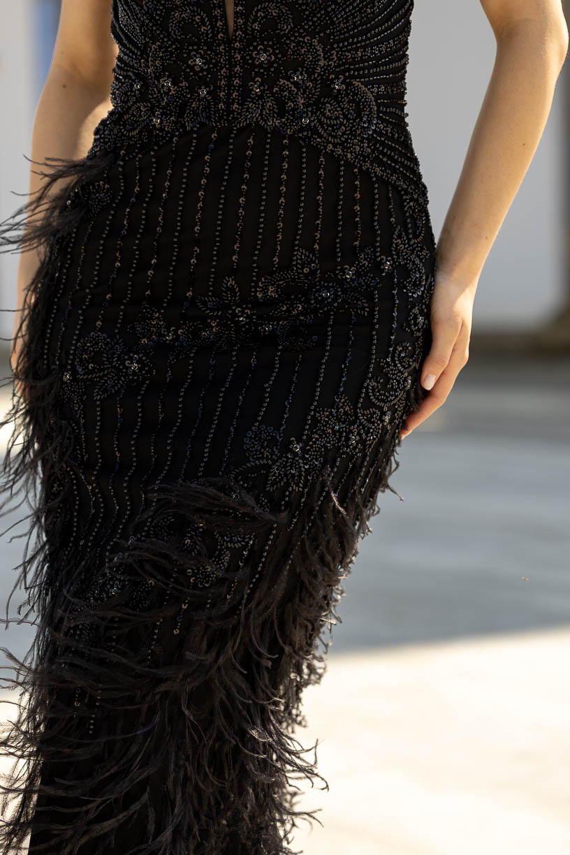 A zona da saia destaca-se pelo contraste de texturas: brilho estruturado combinado com aplicação de penas na parte inferior, que acrescentam movimento, dramatismo e um toque de alta-costura.