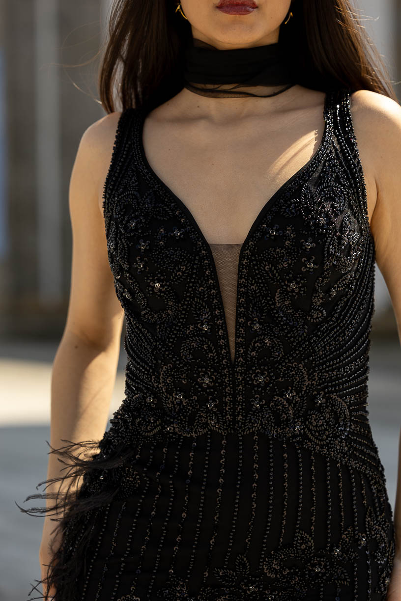 VESTIDO PRETO COM BRILHO E PENAS PONTO CHIC