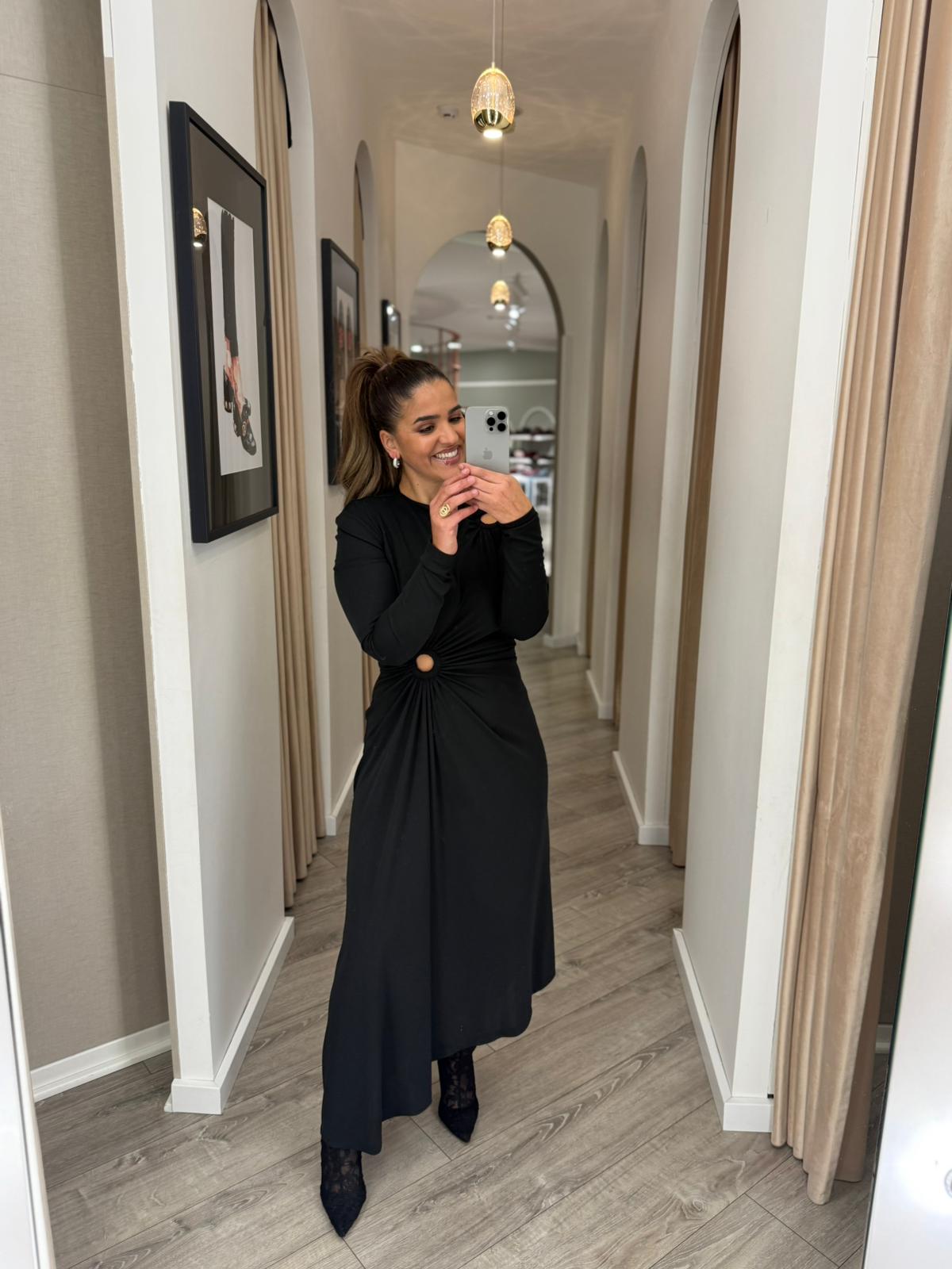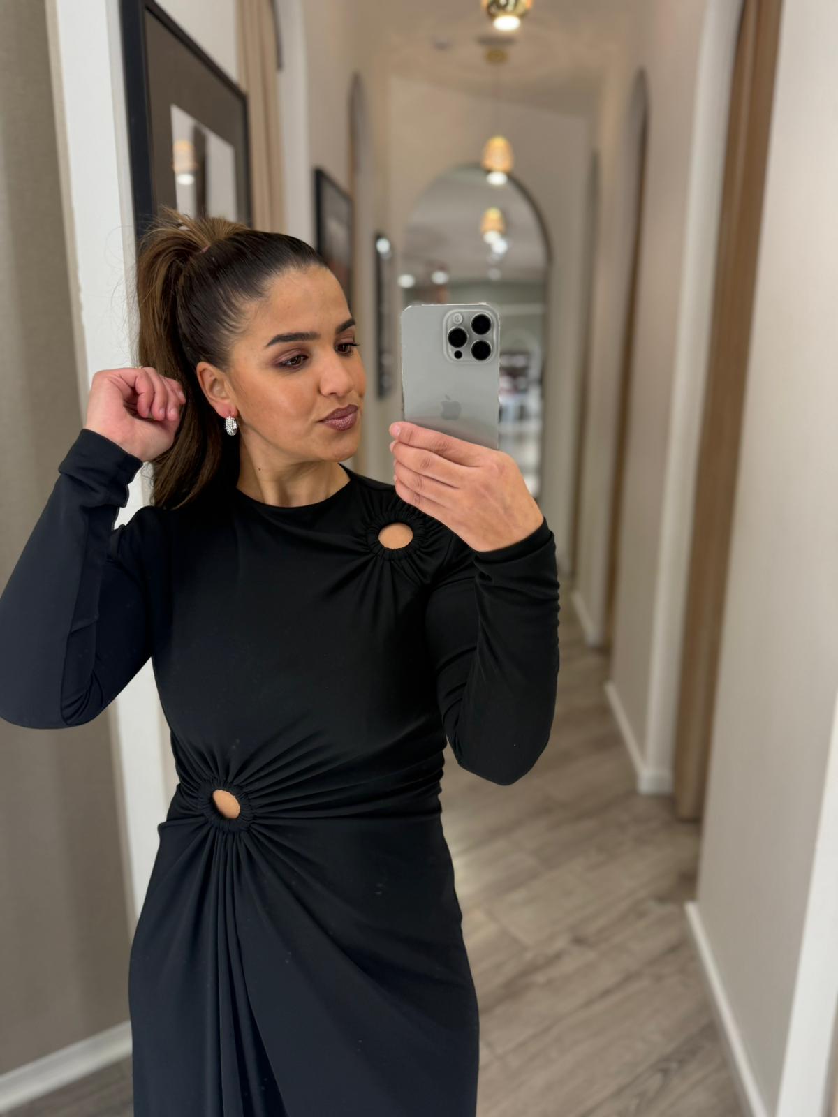 A peça apresenta dois pontos de franzido estratégicos — um ao nível do peito e outro na zona da cintura — que criam recortes circulares e drapeados profundos, desenhando a silhueta de forma única e altamente feminina. Estes efeitos conferem dinamismo e transformam um vestido preto num statement sofisticado.