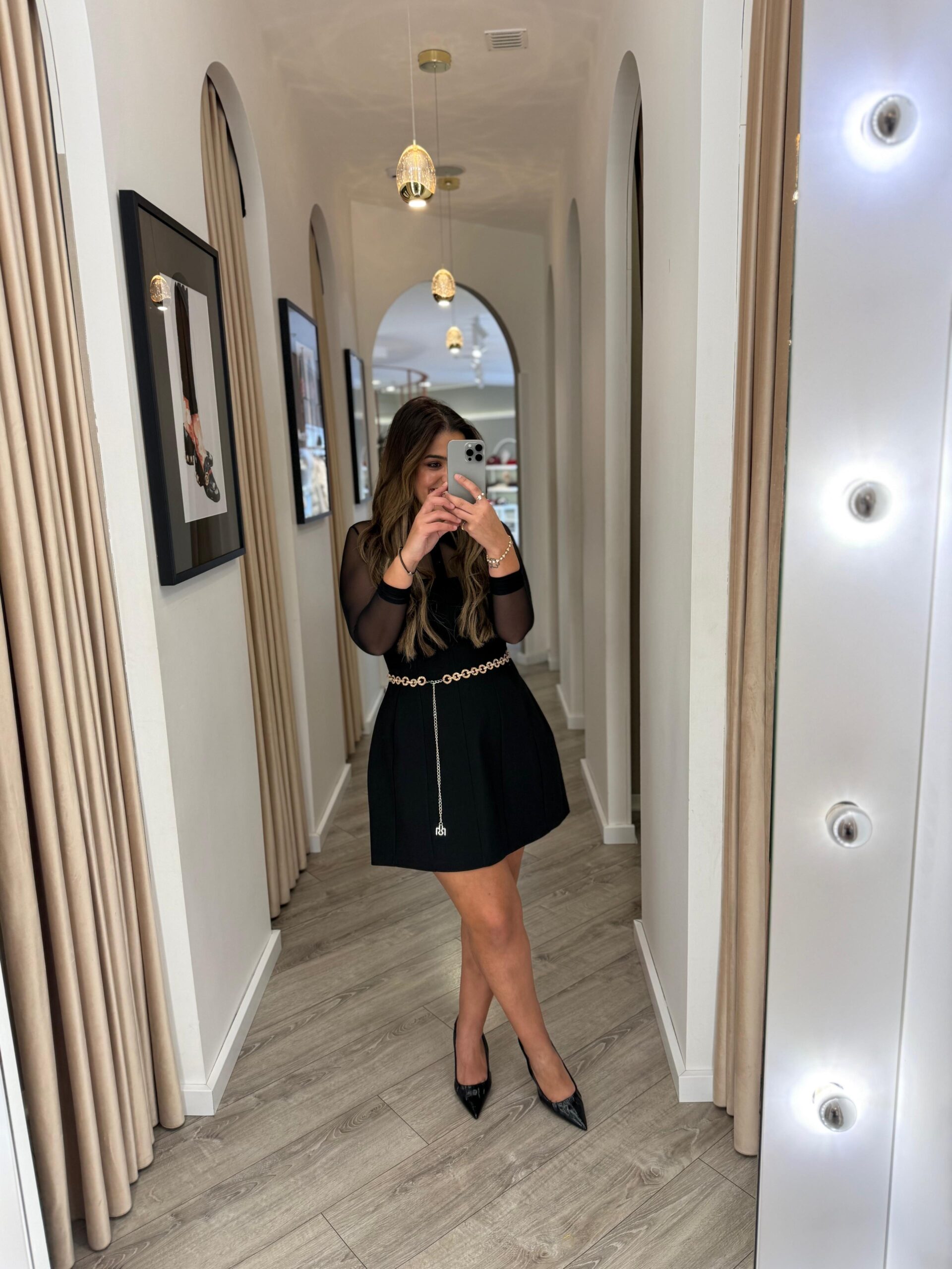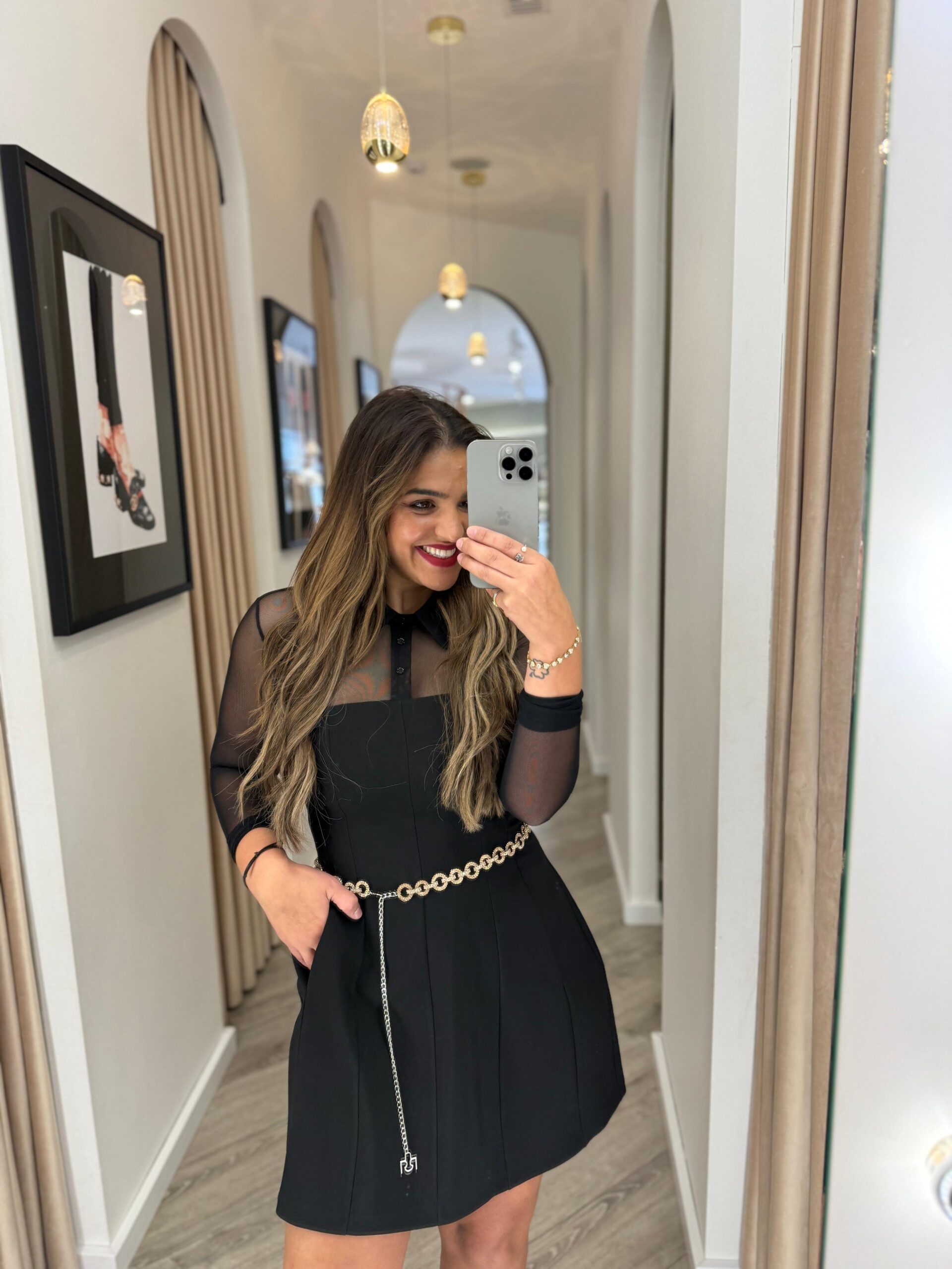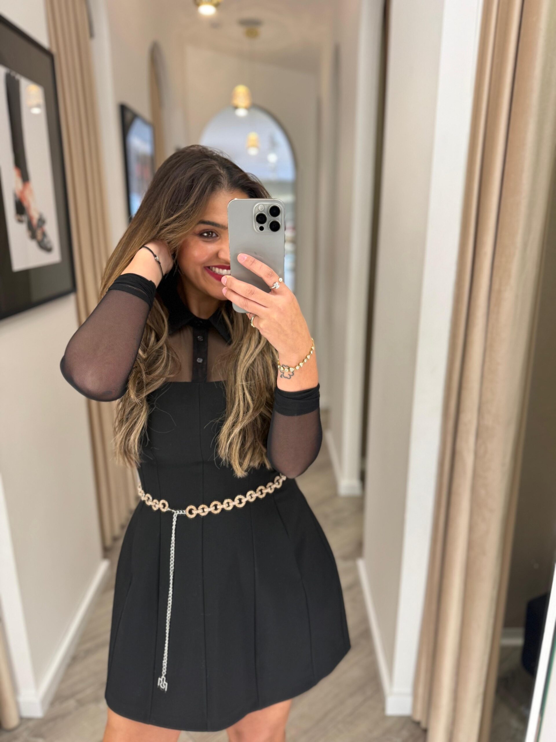 VESTIDO PRETO COM MANGAS EM TULE E CINTO IMPERIAL