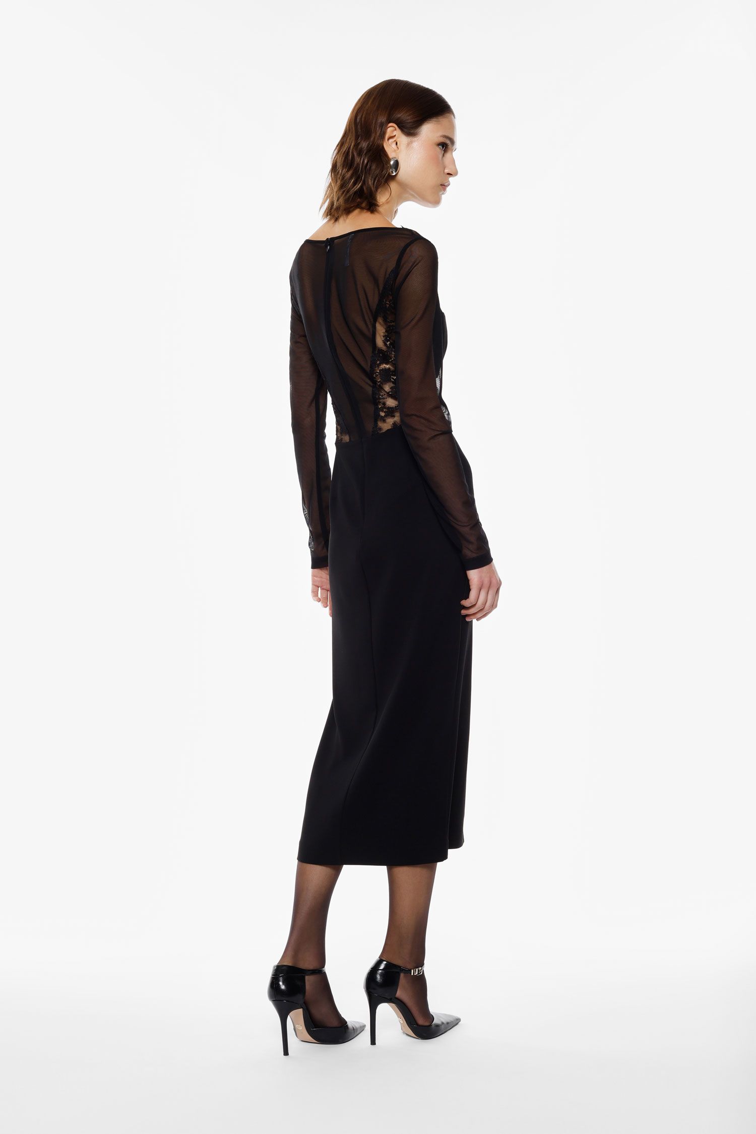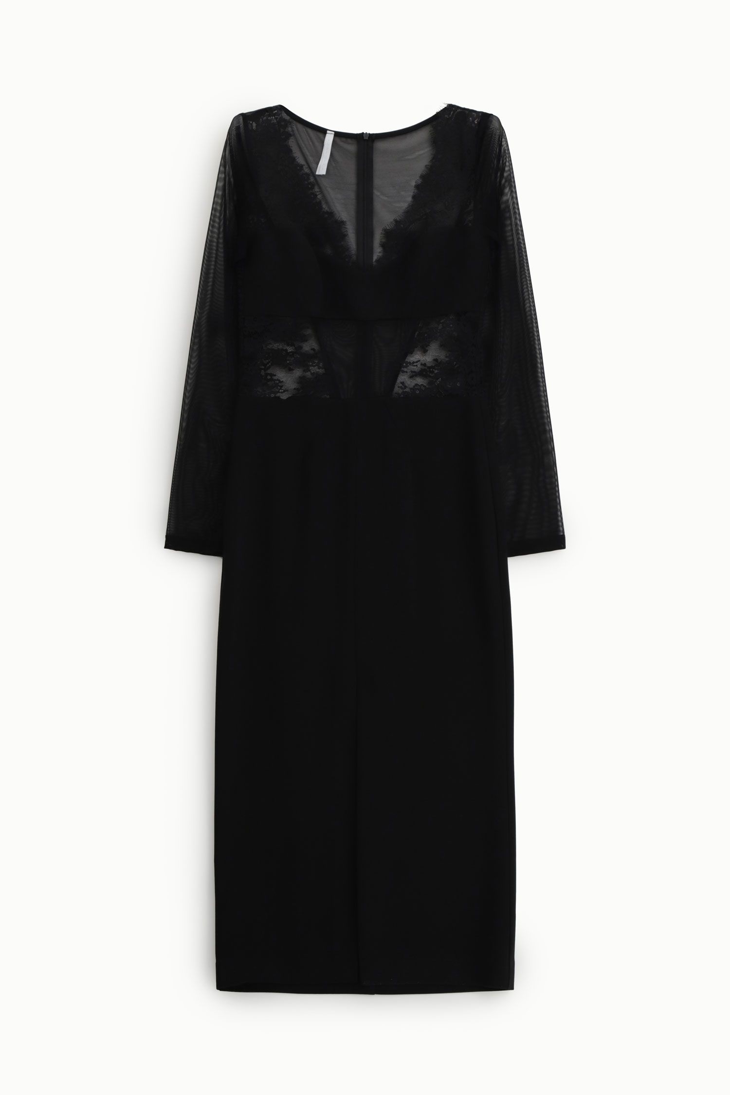O design combina aplicações de renda delicada no corpo com tule transparente no decote e nas mangas, criando um jogo de transparências feminino e refinado. O fecho posterior assegura um acabamento discreto, enquanto o corte cuidadosamente estruturado valoriza a silhueta de forma natural e equilibrada. A saia fluida acrescenta movimento e leveza ao conjunto.