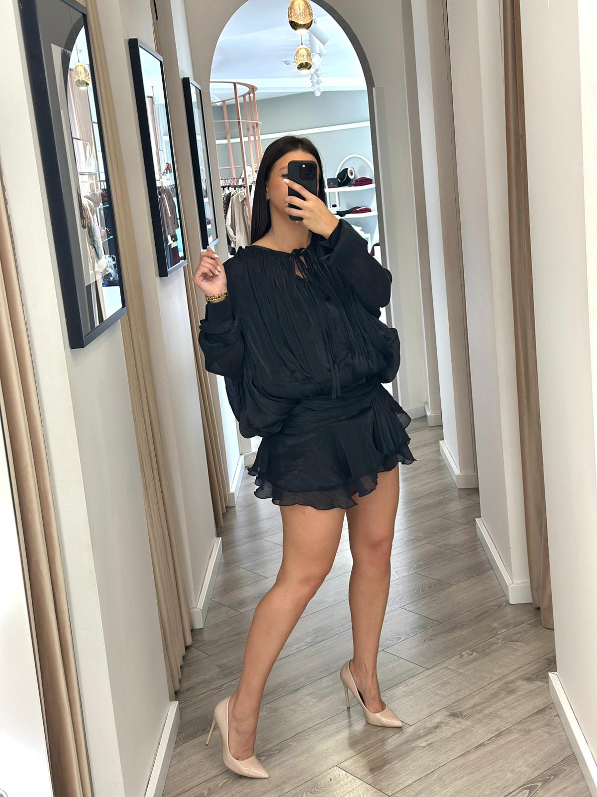 Com design plissado em toda a extensão, o modelo apresenta mangas compridas volumosas, e cintura ajustada que valoriza a silhueta. Acompanha ainda um calção interior, garantindo maior comodidade e liberdade de movimento. Os acabamentos fluídos e o brilho subtil do tecido elevam a peça, tornando-a única e versátil.