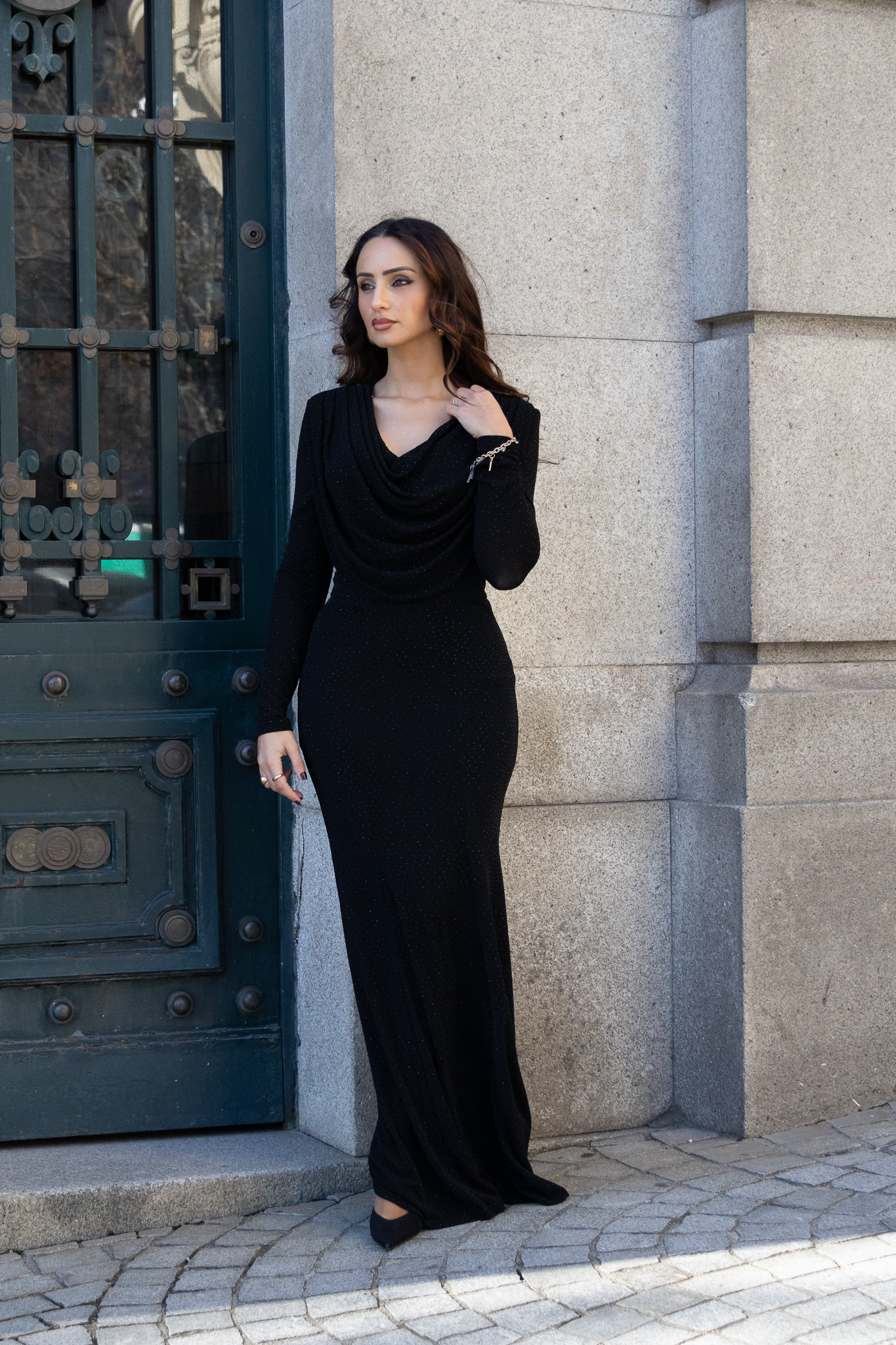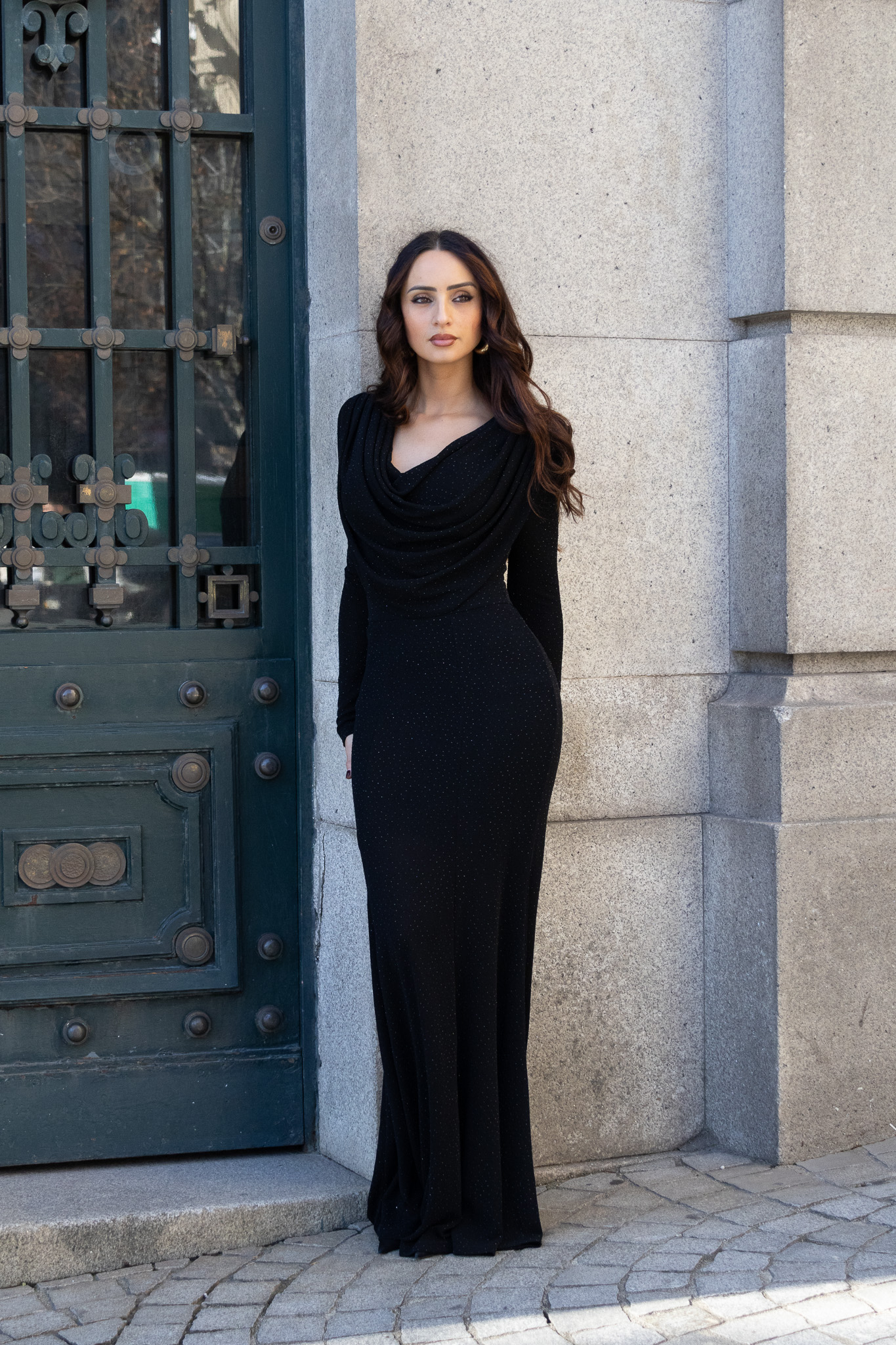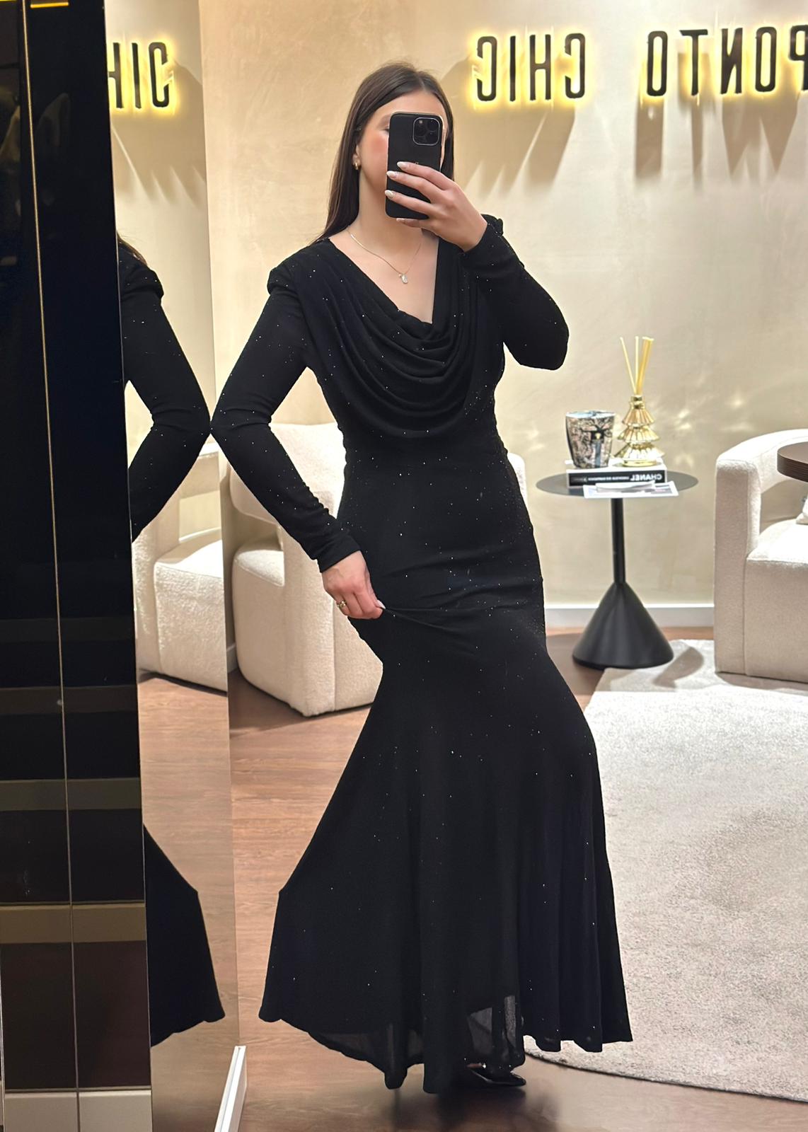 VESTIDO PRETO DRAPEADO COM BRILHOS PONTO CHIC