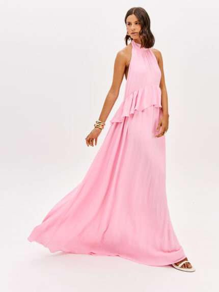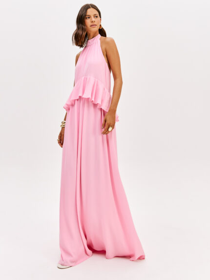 VESTIDO LONGO ROSA COM FOLHO LANÇA PERFUME