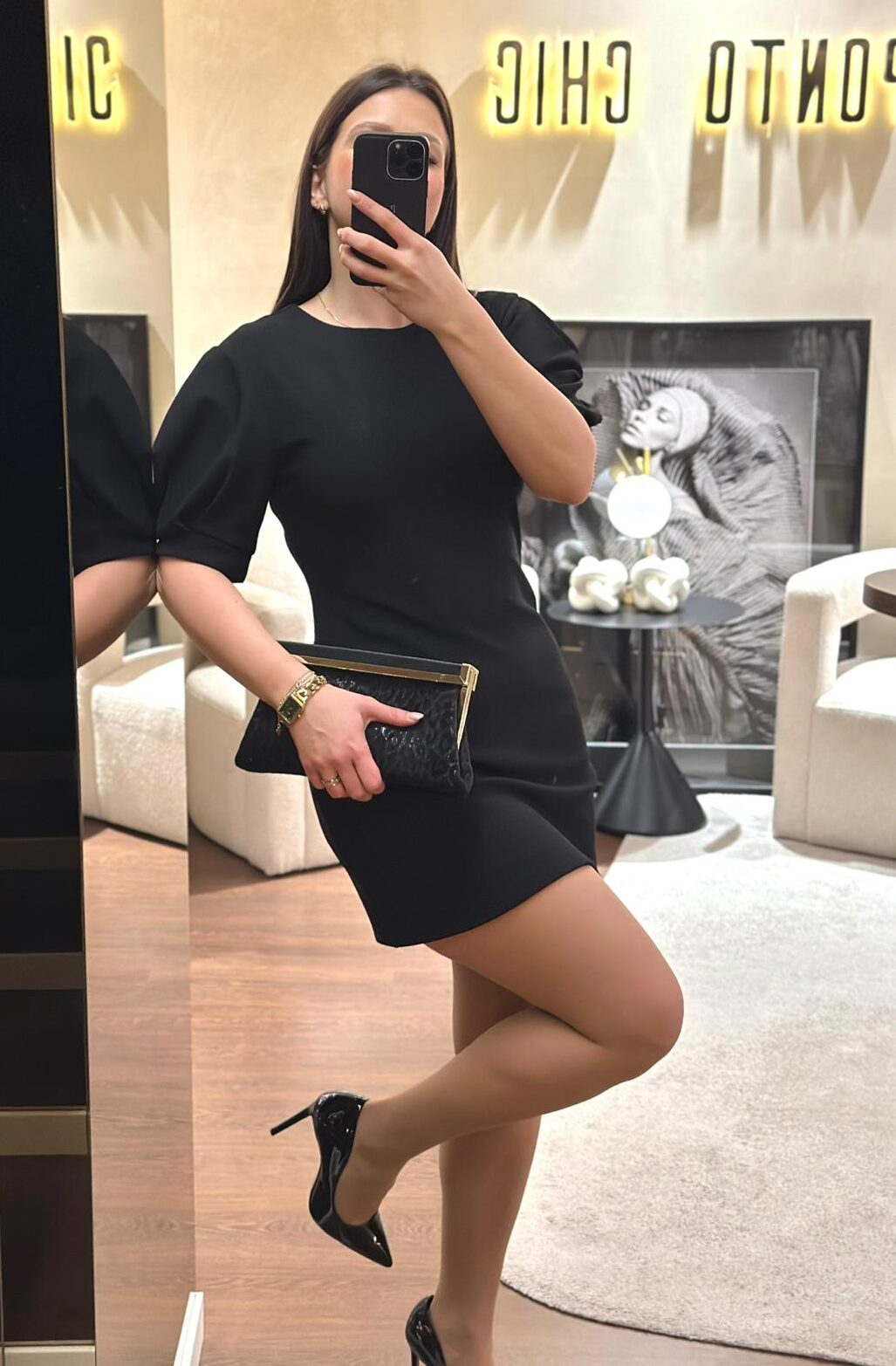 Vestido em tom preto de linhas minimalistas e elegantes, pensado para uma silhueta sofisticada e intemporal. O design clean é valorizado pelas mangas curtas estruturadas com pregas subtis e punho largo, que acrescentam volume e presença à peça, conferindo-lhe um toque contemporâneo e refinado.
