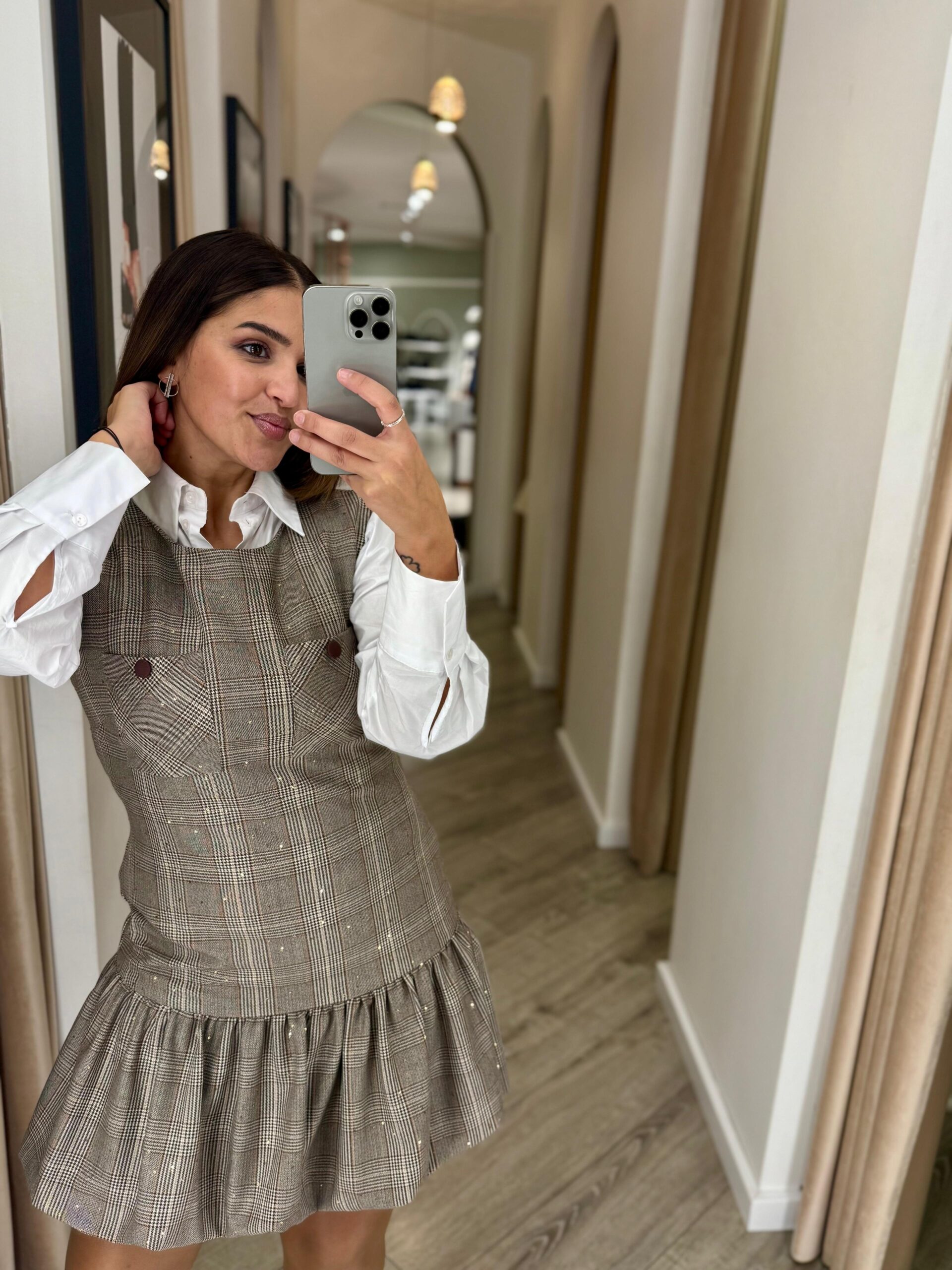 O padrão clássico em xadrez ganha destaque com fios discretos em dourado, que conferem luminosidade subtil à peça. O modelo sem mangas inclui dois bolsos frontais com botão decorativo e folho na bainha, que adiciona movimento e feminilidade ao design.