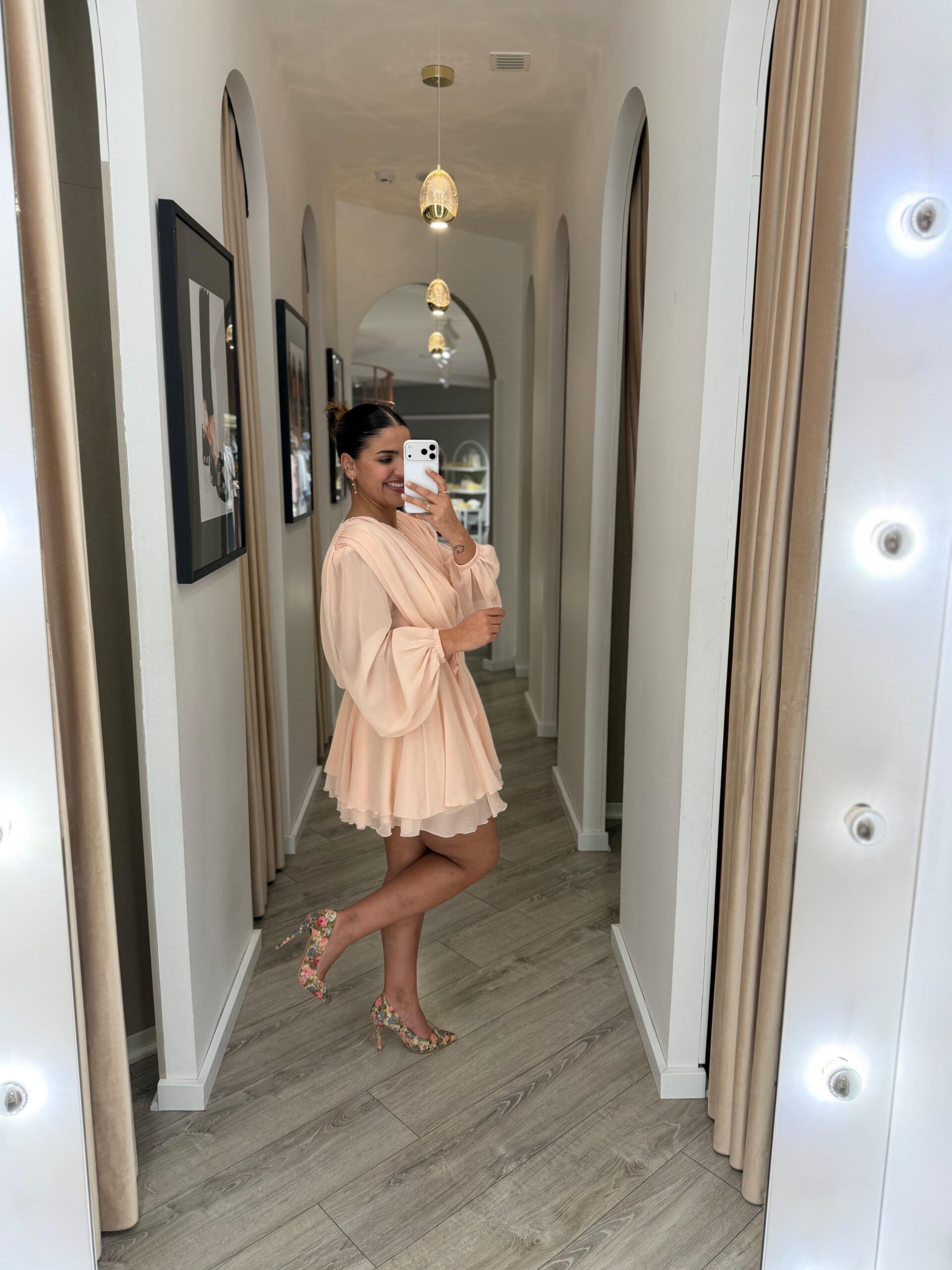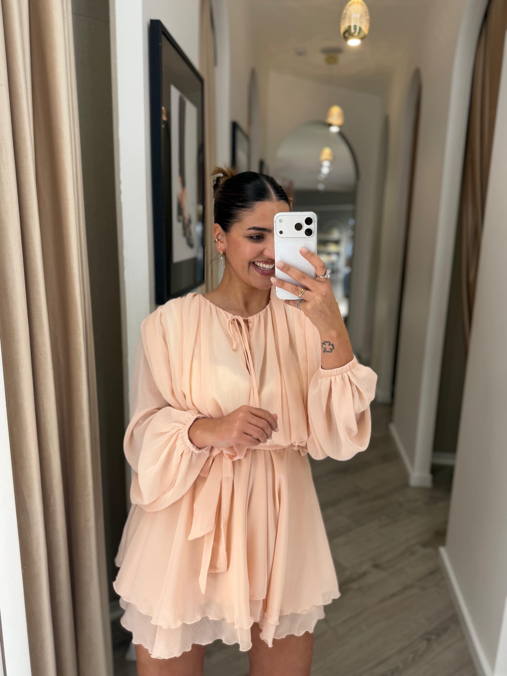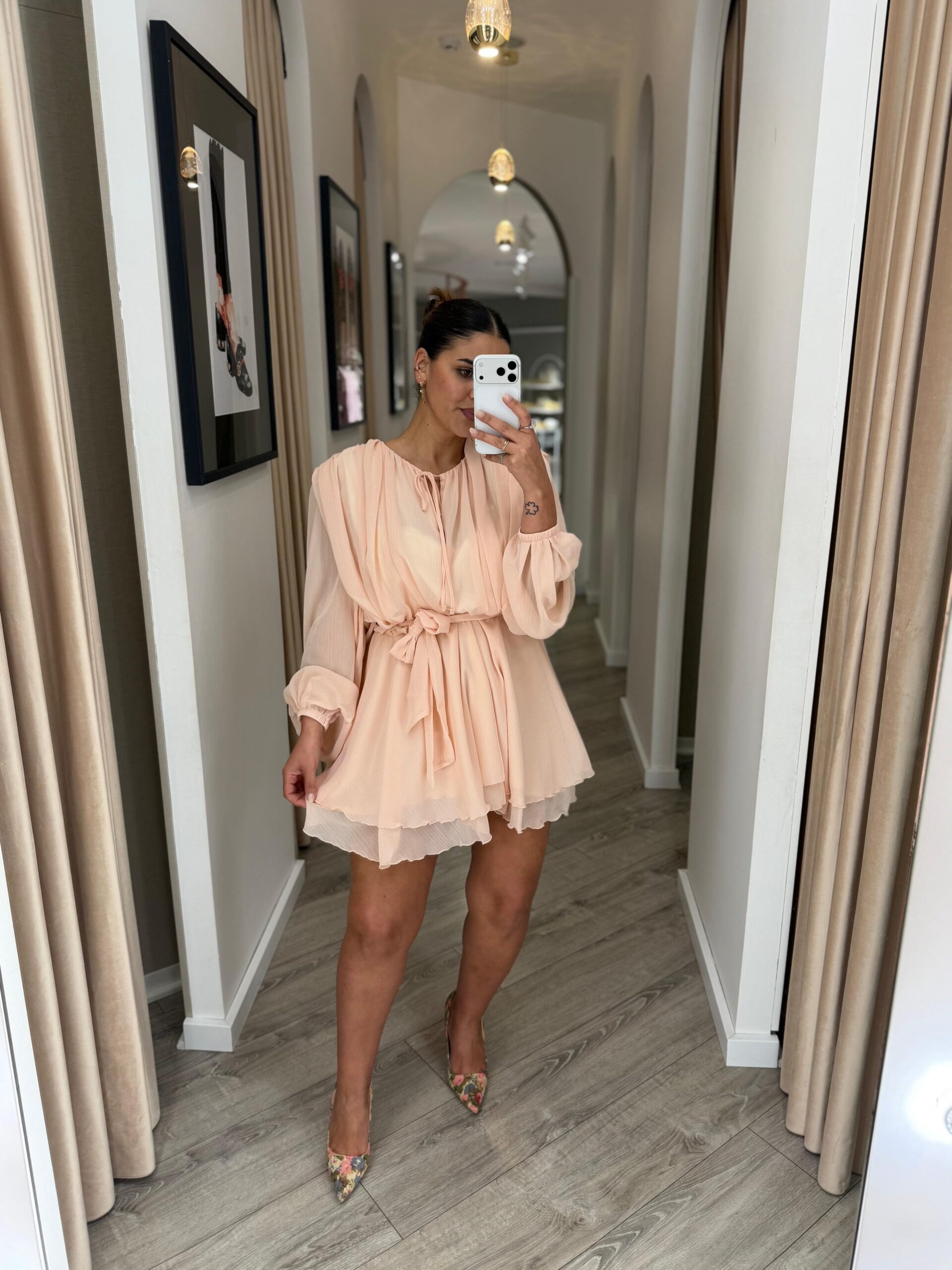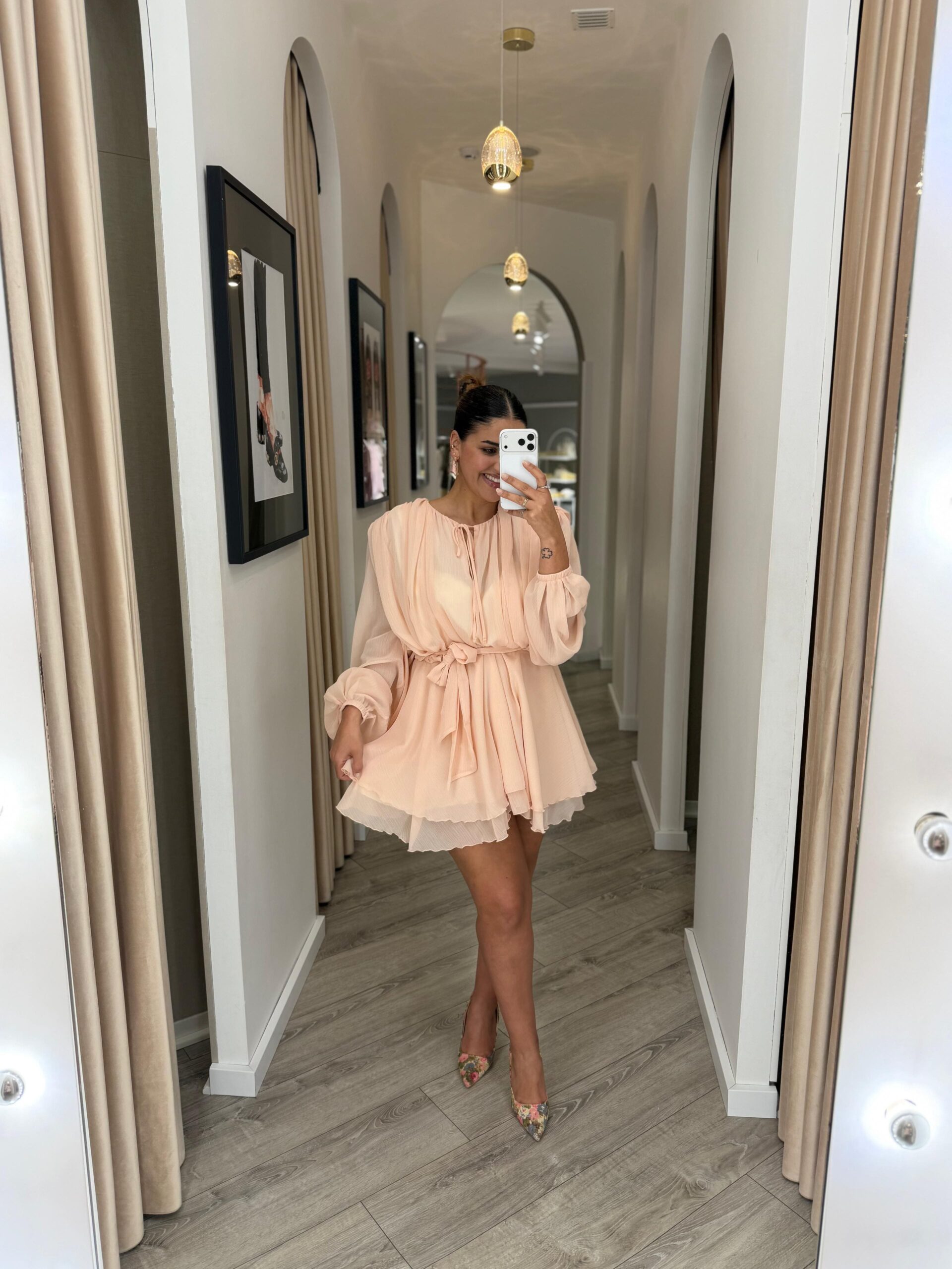 Este vestido em tom rosa bebé destaca-se pela sua leveza e elegância etérea, perfeito para um visual delicado e sofisticado. Confeccionado em 100% poliéster, apresenta um tecido leve e fluido que acompanha o movimento com suavidade.