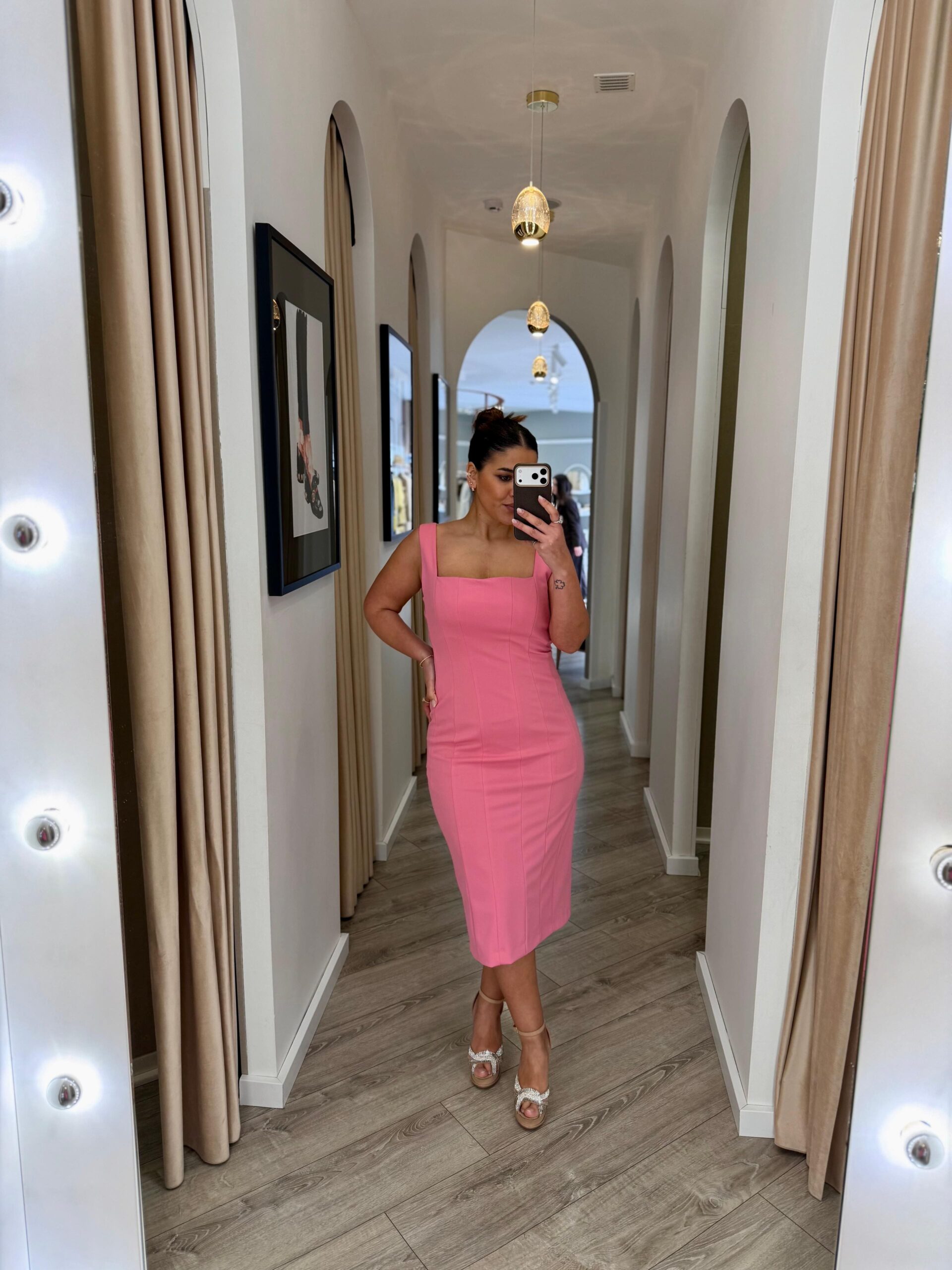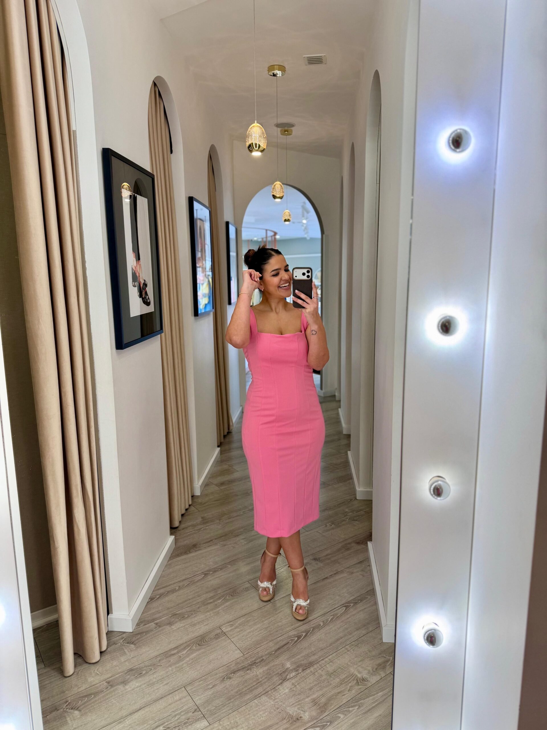 Vestido rosa de inspiração elegante e feminina, pensado para realçar a silhueta com uma estrutura sofisticada e contemporânea. Confecionado em tecido composto por 95% poliéster e 5% elastano, oferece conforto, elasticidade e um cair estruturado que acompanha o corpo de forma harmoniosa.
