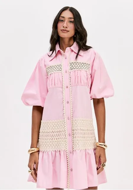 VESTIDO ROSA COM RENDA E MANGA ABALONADA LANÇA PERFUME