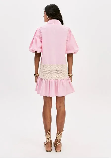Vestido curto em tom rosa suave, de inspiração romântica e feminina, confeccionado em 100% algodão, garantindo um toque natural, fresco e confortável.