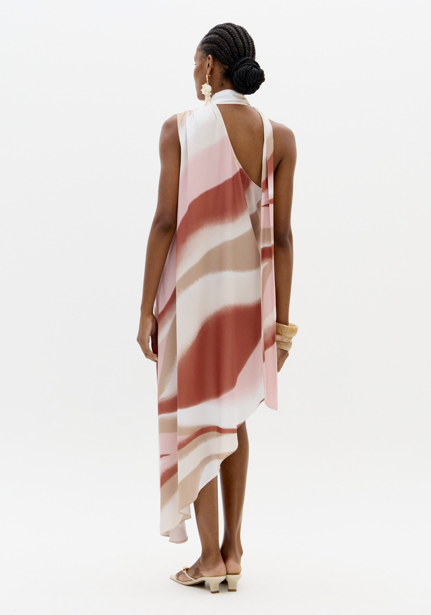 Este vestido destaca-se pela sua fluidez elegante e pela combinação harmoniosa de tons rosa e camel, criando um efeito visual sofisticado e contemporâneo. Confeccionado em 100% poliéster, apresenta um tecido acetinado com brilho subtil e um toque sedoso que acompanha o movimento com naturalidade.
