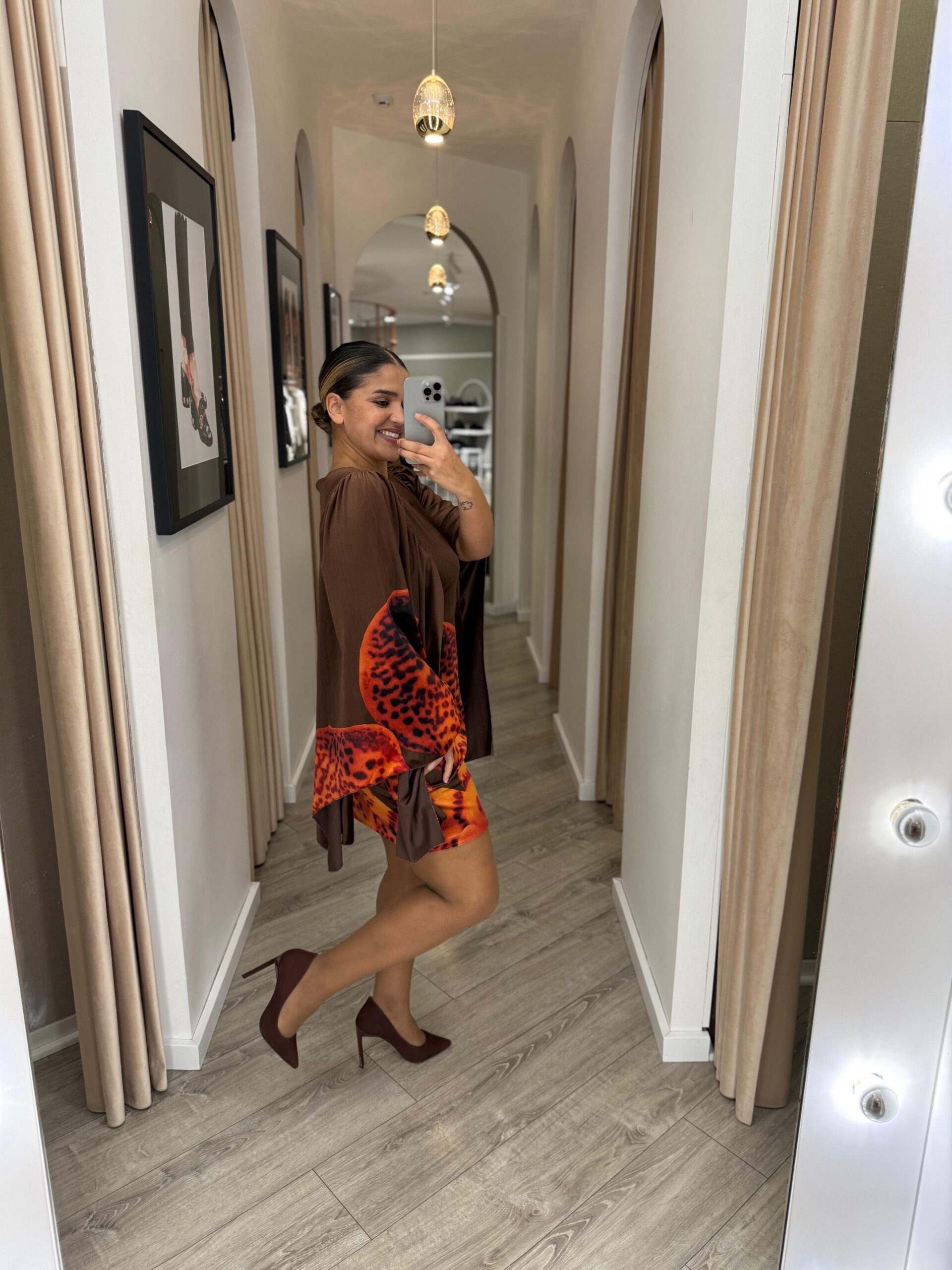 O destaque vai para a estampa artística em tons de laranja queimado e castanho, que cria um jogo visual moderno e expressivo, remetendo a formas orgânicas e fluidas. O corte solto e o movimento leve do tecido garantem elegância e um cair impecável, perfeito para destacar a silhueta de forma subtil.