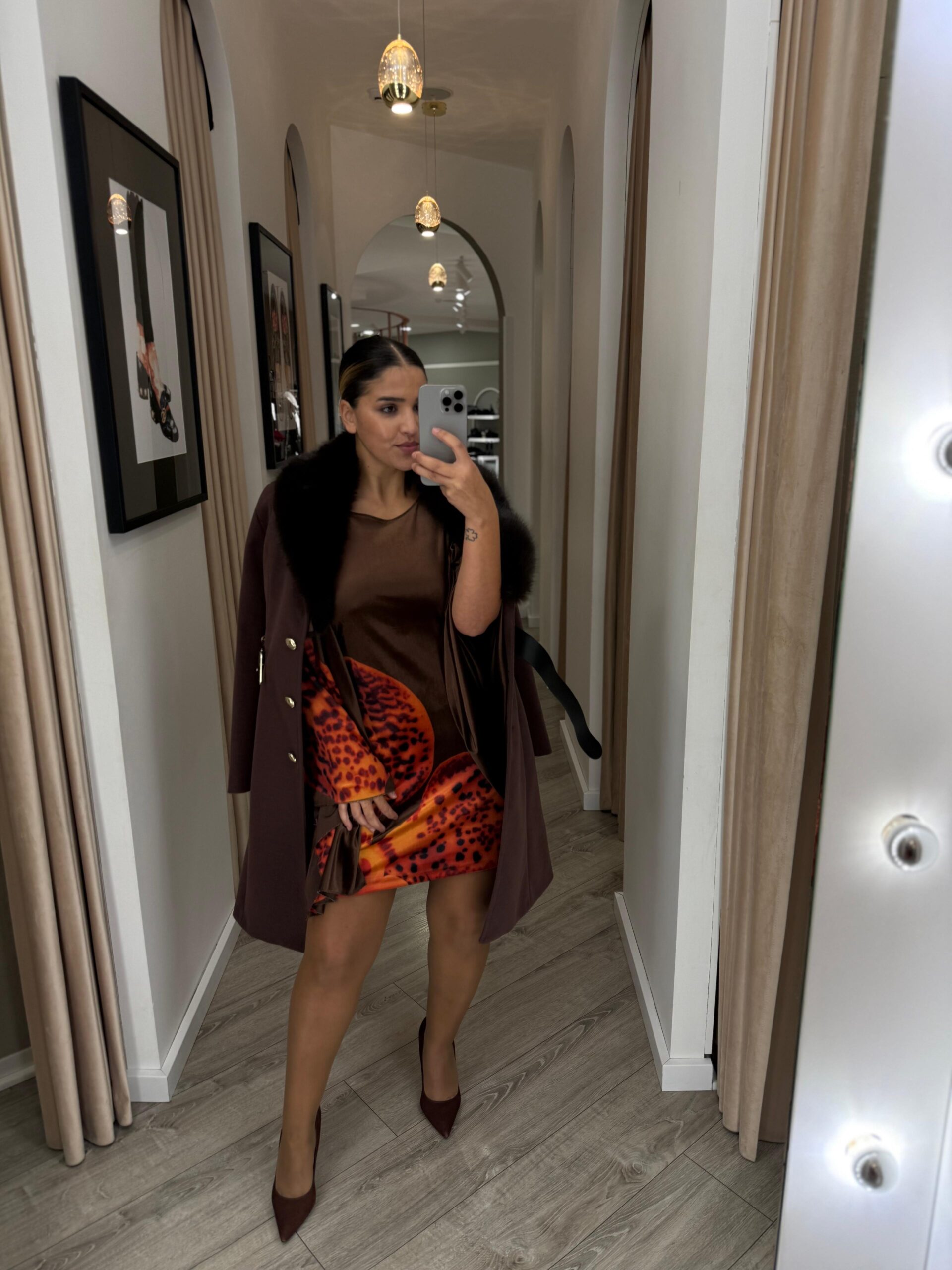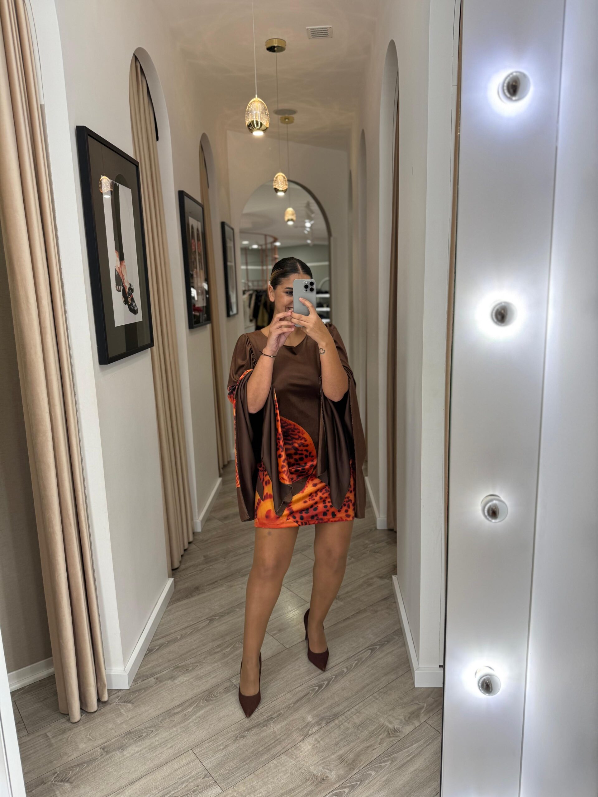 VESTIDO VELUDO CASTANHO COM ESTAMPA ARTÍSTICA SAHOCO