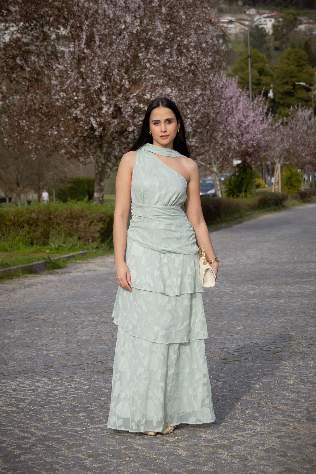 Vestido em tom verde-água com textura floral subtil no tecido, que acrescenta profundidade e elegância à peça. O design assimétrico de um ombro só cria uma silhueta moderna e feminina, valorizando o colo de forma delicada.