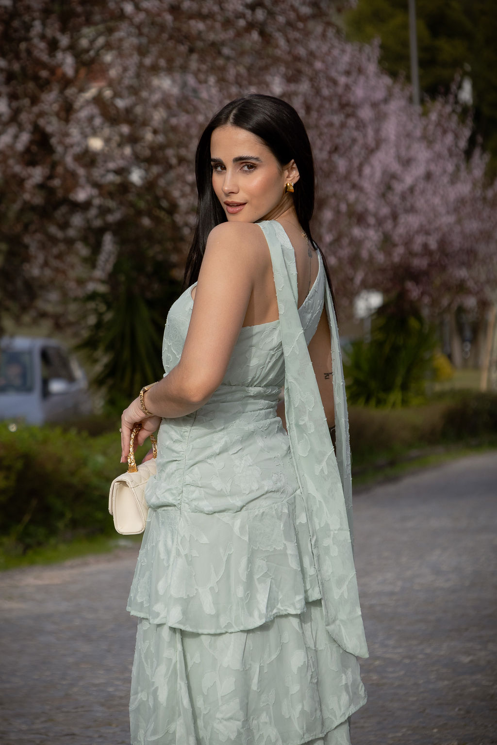 A parte superior apresenta drapeado suave que molda o corpo, enquanto a saia ganha movimento através de folhos em camadas, criando um efeito fluido e romântico a cada passo.