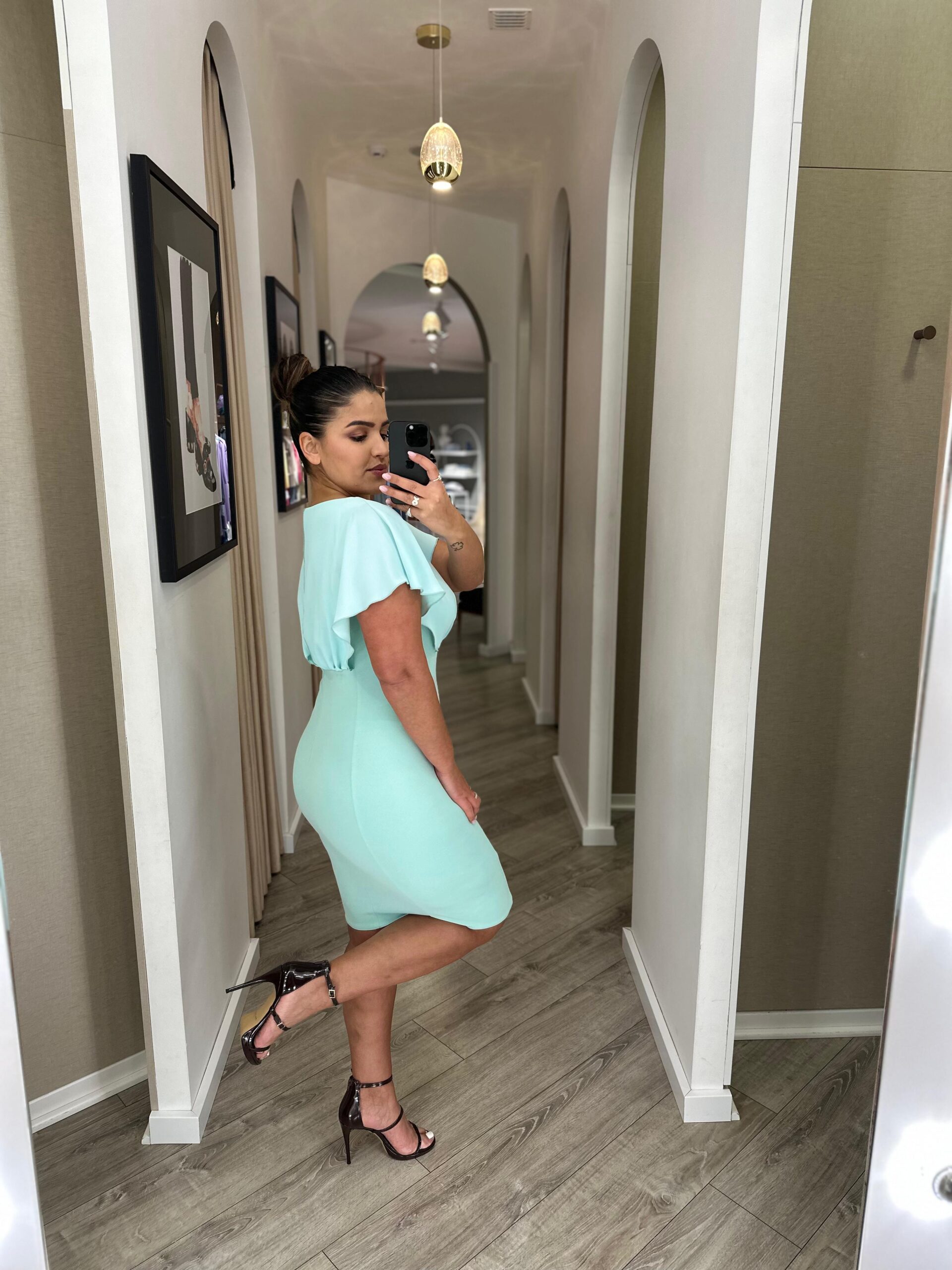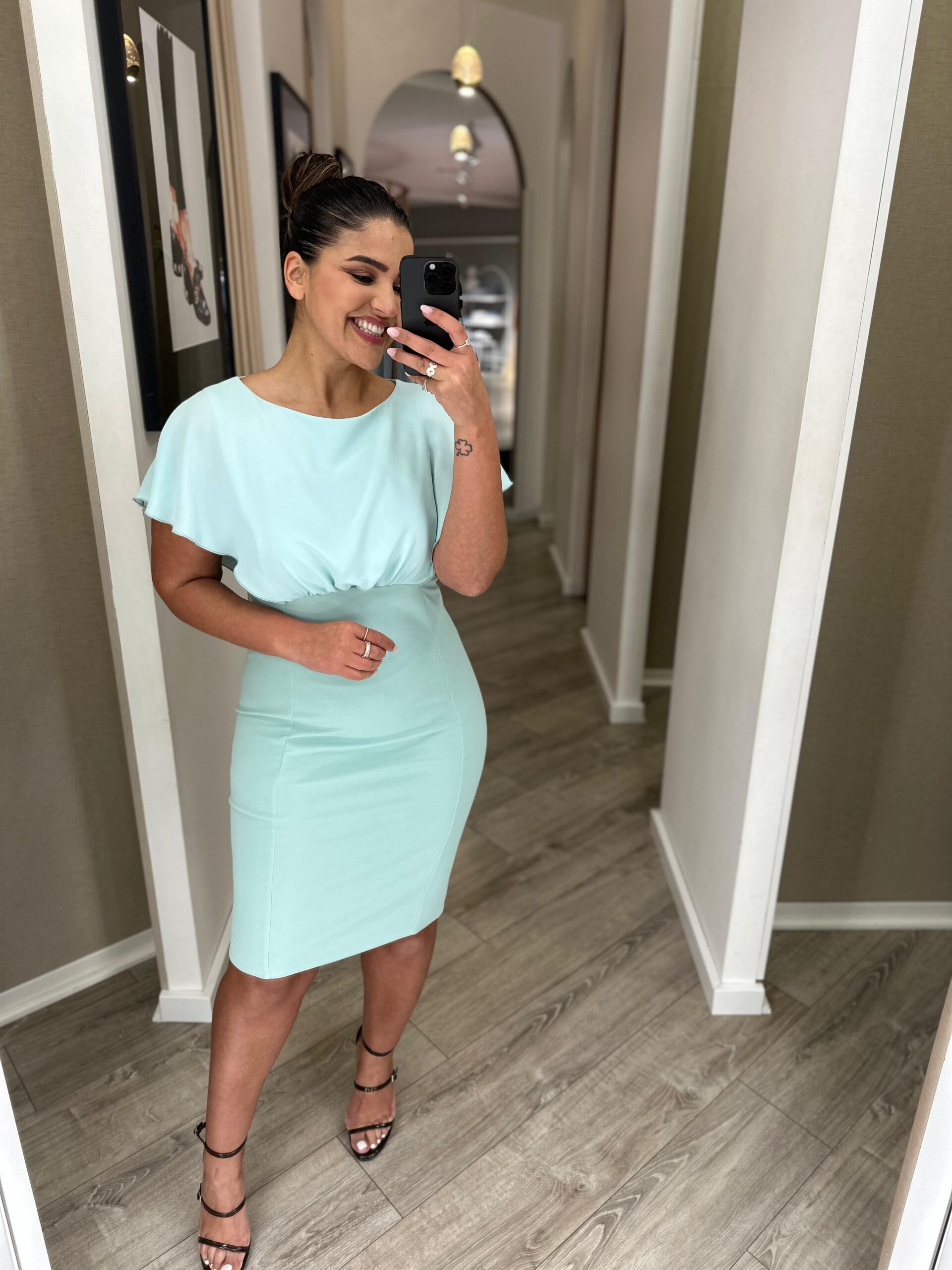 O vestido verde-água da marca Rinascimento é uma peça de elegância subtil, ideal para ocasiões especiais e eventos de cerimónia. Confeccionado em 95% poliéster e 5% elastano, com forro em 100% poliéster, combina conforto, fluidez e um caimento impecável.